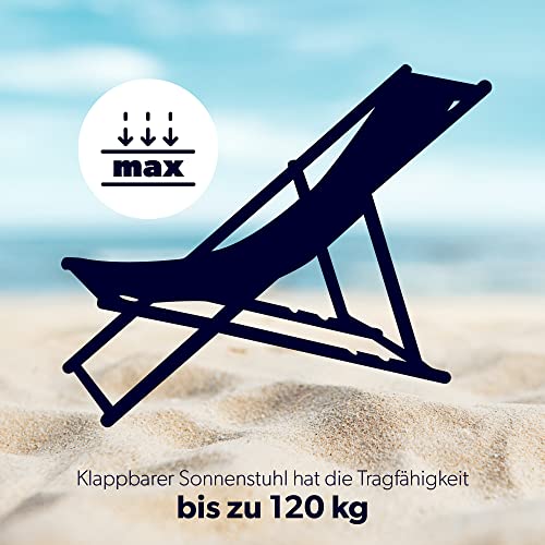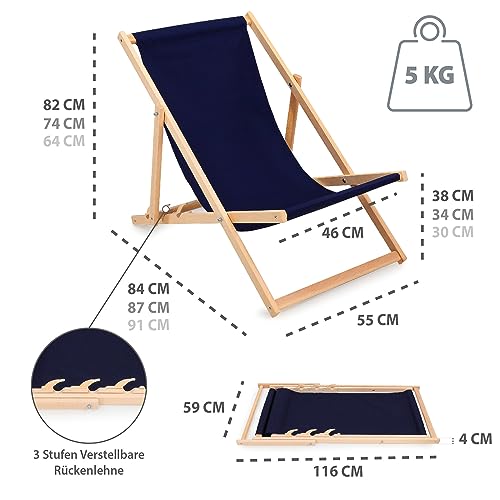 Dieser Liegestuhl ist einfach klasse! Aus massivem Buchenholz - stabil und langlebig. Bis zu 95kg belastbar, also für die meisten Leute perfekt. Die Rückenlehne ist 3-fach verstellbar - von aufrecht bis komplett liegend. Mit breiten dunkelblauen Streifen - sieht aus wie am Strand! Zusammenklappbar für platzsparende Aufbewahrung und einfachen Transport. Nur etwa 4kg schwer - leicht zu tragen. Der Polyester-Bezug ist pflegeleicht und atmungsaktiv. Perfekt für Garten, Terrasse, Balkon oder Strandurlaub. Einfach ein zeitlos schöner Liegestuhl für entspannte Stunden!