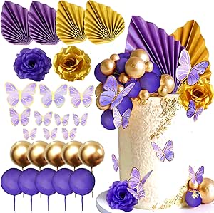 Zauberhafte Tortenverzierung in traumhaftem Lila! Dieses komplett Set enthält alles für die perfekte Torte: 5 lila Kugeln, 5 goldene Kugeln, 10 Schmetterling-Bastelmaterialien, 1 lila Rose, 1 goldene Rose, 1 lila Palmenblatt und 1 goldenes Palmenblatt. Einfach zu montieren - selbst ohne Backerfahrung gelingen wunderschöne Kreationen. Perfekt für Geburtstagstorten, Hochzeitstorten, Baby-Partys oder festliche Anlässe. Mach jede Torte zum absoluten Highlight! Ideal als Geschenk für Hobbybäcker oder zur eigenen Verwendung. Deine Gäste werden begeistert sein!