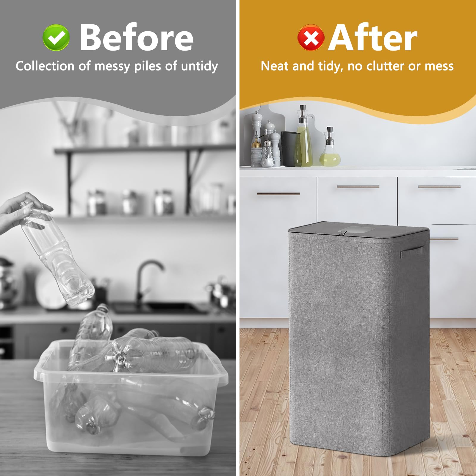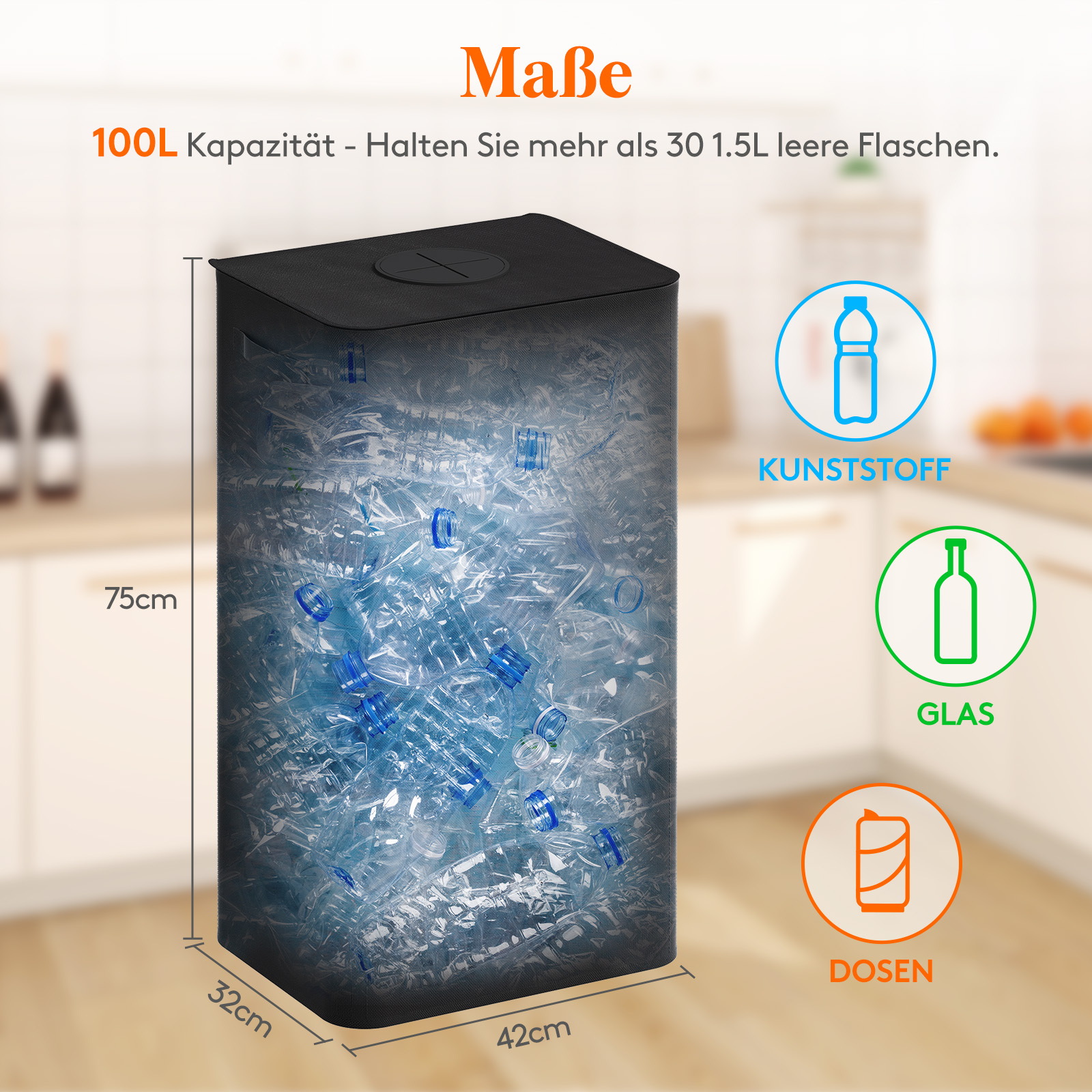Alter, dieser Pfandflaschensammler ist die Lösung für das Leergut-Chaos! Mit stolzen 100 Litern Fassungsvermögen passt da der Pfand von 2-4 Wochen für eine ganze Familie rein. Maße 40,5 x 33 x 75 cm - groß genug aber nicht zu klobig. Der Deckel hat einen praktischen elastischen Einwurfschlitz - einfach Flaschen reinschieben ohne Deckel öffnen zu müssen! Die entnehmbare Innentasche ist der Knaller - einfach ausklinken und zum Pfandautomaten tragen. Aus robustem Polyester-Oxford Stoff der wasserabweisend ist und nicht so schnell schmutzig wird. Der Hartpapp-Deckel gibt Stabilität. In dunkelgrau sieht er schick aus und zeigt nicht jeden Fleck. Einfach in Minuten montiert - Stützstangen in die Ecken und fertig! Wenn er leer ist, kann man ihn platzsparend zusammenfalten. Perfekt für Küche, Garage oder Balkon. Endlich keine rumstehenden Pfandkisten mehr! Macht das Sammeln und Wegbringen so viel einfacher. Auch super für Glasabfall oder Dosen. Einfach ein geniales Teil das sich schnell bezahlt macht - sowohl in Ordnung als auch in Pfandgeld!
