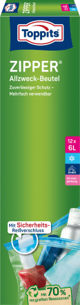 Die praktischen Alleskönner für deine Küche! Diese 12 Toppits Allzweckbeutel mit 6 Liter Fassungsvermögen und praktischem Reißverschluss sind ideal zum Einfrieren, Aufbewahren und Organisieren. Ob Fleisch, Gemüse, Backzutaten oder Handwerksbedarf - diese Beutel halten alles frisch und geschützt. Der sichere Verschluss verhindert Auslaufen und Gerüche. Perfekt für Meal Prep, Vorratshaltung oder unterwegs. Spülmaschinenfest und wiederverwendbar - gut für die Umwelt und deinen Geldbeutel. Mit diesen Beuteln hast du immer die richtige Größe parat. Einfach unverzichtbar in jeder Haushaltsvorratskammer!