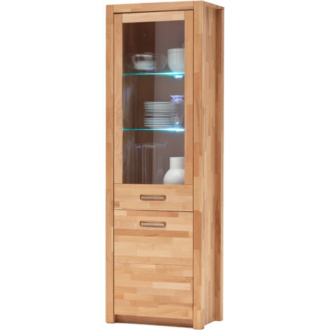Präsentiere deine Schätze in perfektem Licht! Dieser Lomadox Vitrinenschrank aus massiver Kernbuche ist ein absoluter Hingucker. Mit 66x203x40 cm bietet er genug Platz für deine liebsten Sammlerstücke. Die geölte Oberfläche betont die wunderschöne Maserung des Holzes. Die integrierte LED-Glasbodenbeleuchtung setzt alles perfekt in Szene. Hinter den rechts angeschlagenen Türen findest du 2 Glasböden, 1 Einlegeboden und 1 festen Boden - vielseitige Stauraum-Lösungen! Die eingefrästen Metallgriffe sorgen für ein elegantes, modernes Design. Keilgezinkt für maximale Stabilität und Langlebigkeit. Einfache Selbstmontage mit bebilderter Anleitung. Wird zerlegt geliefert mit 2-Mann-Handling bis zum Aufstellort. Perfekt für Wohnzimmer, Flur oder Esszimmer - verwandle deine Lieblingsstücke in eine private Ausstellung!