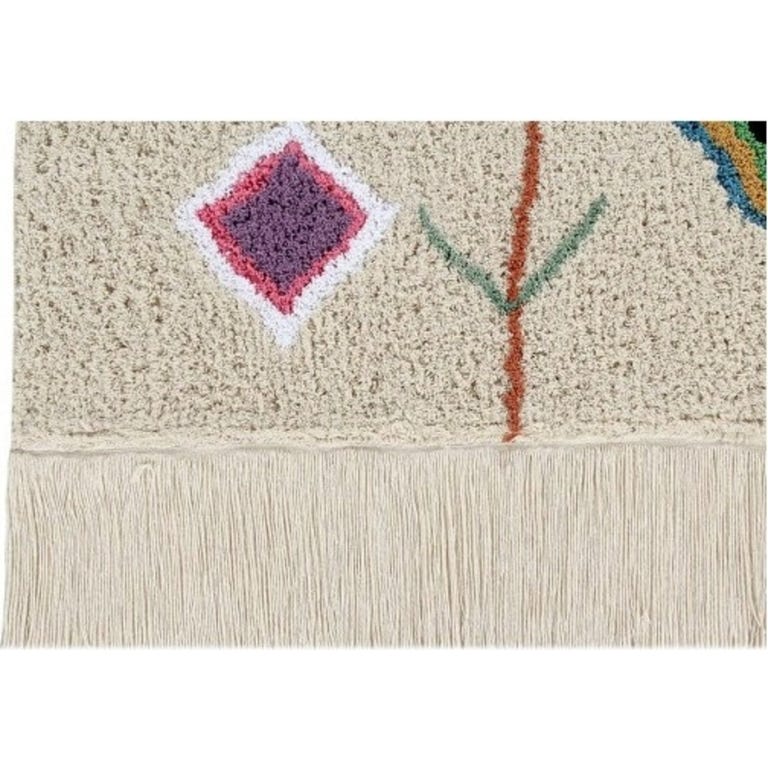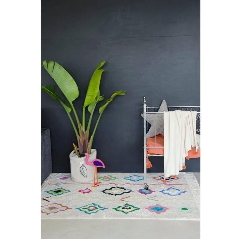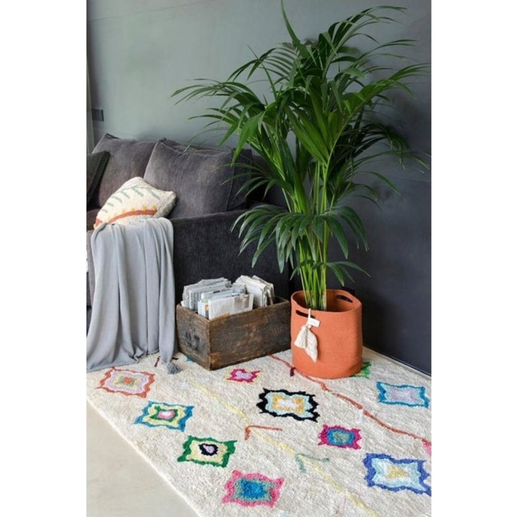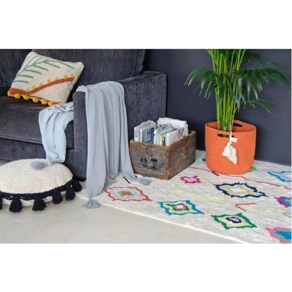 Wow, dieser Kinderteppich von Lorena Canals ist einfach perfekt fürs Kinderzimmer! Mit 200x140cm Größe bietet er genug Platz zum Spielen und Toben. Das bunte Rautenmuster in Multicolor sieht total fröhlich aus und die natürlichen Fransen an den Rändern geben ihm diesen besonderen Look. Das beste: Er ist komplett maschinenwaschbar! Einfach bei 30°C im Schonwaschgang waschen, leichte Seife verwenden und keinen Weichspüler. Danach am besten im Trockner bei niedriger Temperatur trocknen - nicht in der Sonne! Handgefertigt aus natürlicher Baumwolle mit ungiftigen Farbstoffen, also absolut sicher für deine Kleinen. Jeder Teppich ist ein Unikat, da er von Hand gemacht wird - das macht ihn so besonders! Perfekt um das Kinderzimmer gemütlich zu machen und gleichzeitig praktisch für den Alltag mit Kindern.