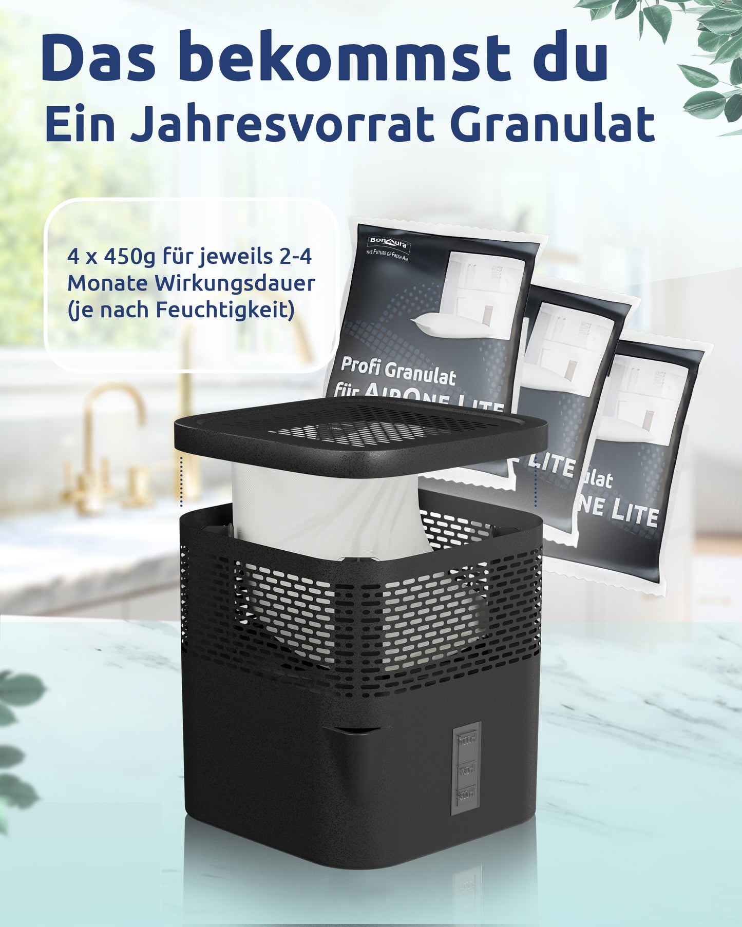 Schluss mit feuchter Luft und muffigen Gerüchen! Dieses 4er-Set BonAura Luftentfeuchter Granulat ist deine Lösung für ein besseres Raumklima. Jede Packung hat 450g des starken Granulats, das Feuchtigkeit aus der Luft zieht wie ein Schwamm. Perfekt für Räume bis 16m² - ob Schlafzimmer, Bad, Keller oder Wohnwagen. Einfach in den BonAura AirOne Entfeuchter füllen und die Magie wirken lassen. Bekämpft effektiv Kondenswasser an Fenstern, Schimmelbildung und unangenehme Gerüche. Besonders praktisch beim Wäschetrocknen, Kochen oder Duschen. Ohne Stromverbrauch - einfach und umweltfreundlich. Mit diesem Sparset hast du lange was von deinem Entfeuchter und sparst dabei noch Geld. Für frische, angenehme Luft in deinem Zuhause!