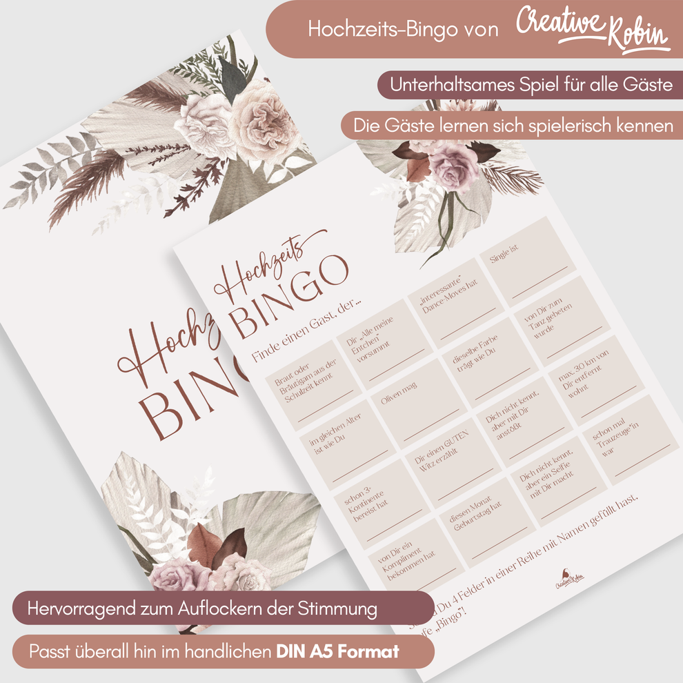Suchst du nach einer lustigen Beschäftigung für deine Hochzeitsgäste? Dieses Foto-Bingo bringt Stimmung in die Feier! 25 verschiedene Karten mit 100 kreativen Aufgaben - aber keine Sorge, nichts Peinliches! Deine Gäste müssen Fotos von besonderen Momenten machen: der erste Kuss, das beste Lachen, das schönste Kleid... Das Tolle: Am Ende habt ihr nicht nur einen Bingo-Gewinner, sondern auch richtig viele tolle Erinnerungsfotos! Alles nachhaltig in Deutschland produziert, im schicken weißen Design das zu jeder Hochzeit passt. Einfach Karten verteilen und den Spaß genießen!