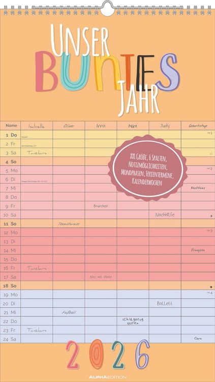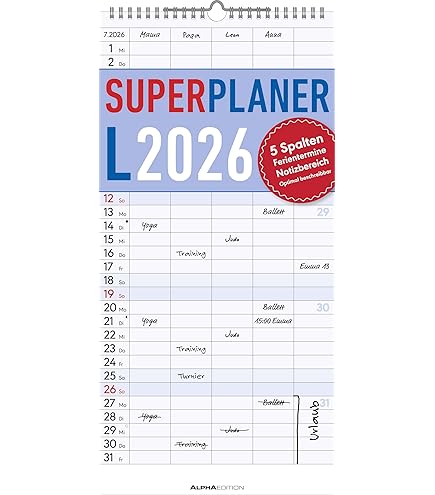 Organisation wird zum Vergnügen! Der Alpha Edition Superplaner M 2026 ist dein bester Helfer für den durchorganisierten Familienalltag. Mit 4 klar getrennten Spalten kannst du für jedes Familienmitglied oder verschiedene Bereiche separate Einträge machen - nie wieder Chaos bei Terminen! Großzügiges 22x45 cm Format bietet viel Platz für Notizen, sieht aber an der Wand nicht überladen aus. Enthält alle deutschen Feiertage für Deutschland, Österreich und Schweiz plus Schulferientermine - perfekt für die Jahresplanung! Hergestellt in Deutschland auf FSC-zertifiziertem Papier aus nachhaltiger Forstwirtschaft. Stabile Spiralbindung mit praktischer Aufhängevorrichtung. Farbenfrohes Design macht selbst lästige Termineingaben spaßig. Perfekt für Küche, Flur oder Home-Office. Mit extra Notizbereich unter dem Kalendarium für wichtige To-Dos und Erinnerungen. Starte organisiert ins Jahr 2026 - ob Geburtstage, Arzttermine, Schulaktivitäten oder Urlaube, alles hat seinen Platz! Ein Kalender, der wirklich hält was er verspricht!
