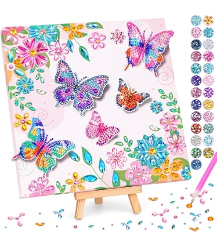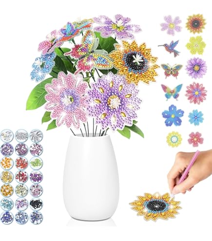 Hey, dieses Diamond Painting Set ist das perfekte Geschenk für kreative Mädchen! Mit 5 großen Blumen, 3 kleinen Blumen, Schmetterlingen und allem nötigen Zubehör können Kinder wunderschöne Blumensträuße gestalten. Einfach die funkelnden Diamanten nach den alphabetischen Anleitungen aufkleben - das fördert die Konzentration, Feinmotorik und Kreativität. Perfekt für Mädchen von 6-12 Jahren, ob alleine oder als gemeinsame Aktivität mit Eltern. Die fertigen Blumen sehen nicht nur toll aus, sondern eignen sich auch super als Zimmerdekoration oder als persönliches Geschenk für Freunde und Familie. Alles in einer Box - einfach auspacken und loslegen! Ein Riesenspaß für kleine Künstlerinnen.