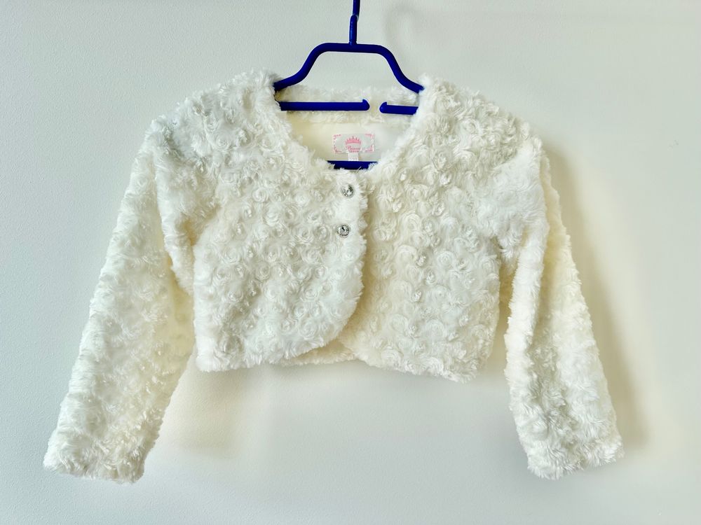 Süße kleine Prinzessinnen aufgepasst! Dieser entzückende Bolero verwandelt eure Tochter in einen strahlenden Star bei jedem besonderen Anlass. Der langärmlige Strick-Cardigan ist nicht nur super hübsch, sondern auch mega praktisch.\n\nDas besondere Detail: Die wunderschöne Lochspitzen-Blume verleiht dem Bolero einen romantischen, festlichen Look. Perfekt um ein einfaches Kleid in etwas Besonderes zu verwandeln oder um die Schultern zu wärmen, ohne die ganze Optik zu verstecken.\n\nAus hautfreundlicher Baumwolle gestrickt, ist der Bolero angenehm weich und kratzt nicht - super wichtig für zarte Kinderhaut. Eure Kleine wird sich darin pudelwohl fühlen und kann ihn stundenlang tragen, ohne dass es unangenehm wird.\n\nEinsatzgebiete ohne Ende:\n• Hochzeiten und Taufen\n• Geburtstagsfeiern\n• Weihnachtsfeiern und festliche Anlässe\n• Fototermine und Familienfeiern\n• Theaterbesuche und Konzerte\n• Erste Kommunion oder Konfirmation\n\nDer Bolero ist in verschiedenen Größen erhältlich - von den ganz Kleinen bis zu größeren Mädchen. Auch mit kurzen Ärmeln verfügbar für wärmere Tage oder drinnen.\n\nPraktisch und stylisch:\n• Leicht über jedes Kleid oder Top zu ziehen\n• Wärmt die Schultern ohne zu überhitzen\n• Verleiht jedem Outfit den letzten Schliff\n• Perfekt für Übergangsjahreszeiten\n\nMacht eure kleine Dame zum Hingucker bei der nächsten Feier - einfach über das Lieblingskleid ziehen und strahlen lassen!