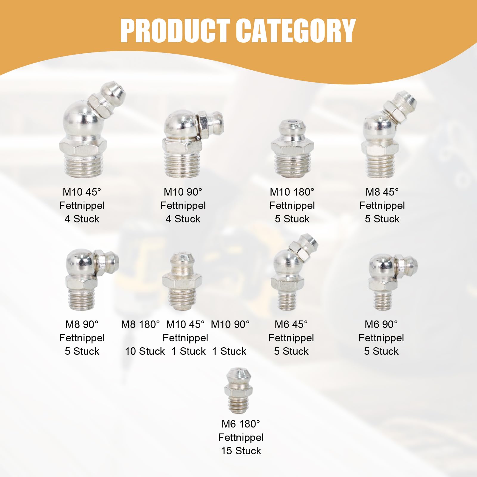 Alles für die perfekte Schmierung! Dieses 105-teilige Schmiernippel-Set hat wirklich alles, was du brauchst. Enthält Nippel in M6, M8 und M10 mit geraden, 45°, 90° und 180° Winkeln. Plus 35 rote Staubschutzabdeckungen. Aus verzinktem Eisen - robust und langlebig. Die tiefen Gewinde sorgen für perfekte Dichtung, kein lästiges Austreten von Schmierstoff. Einfach zu installieren und super für alle Fahrzeuge und Maschinen. Ob Auto, LKW oder Werkstatt-Ausrüstung - hier findest du den passenden Nippel. Mach deine Wartungsarbeiten zum Kinderspiel! Nie wieder suchen - alles griffbereit in einem Set.
