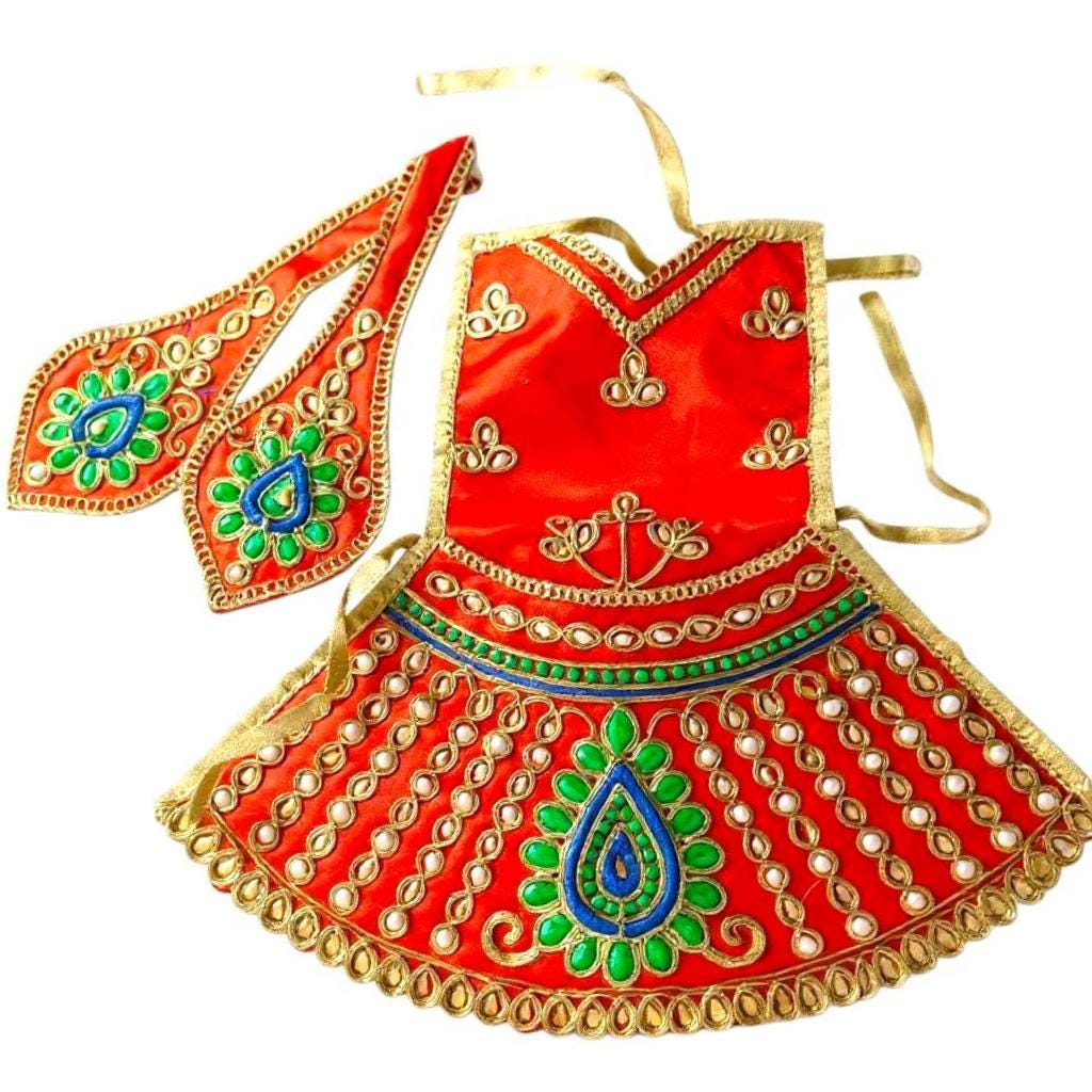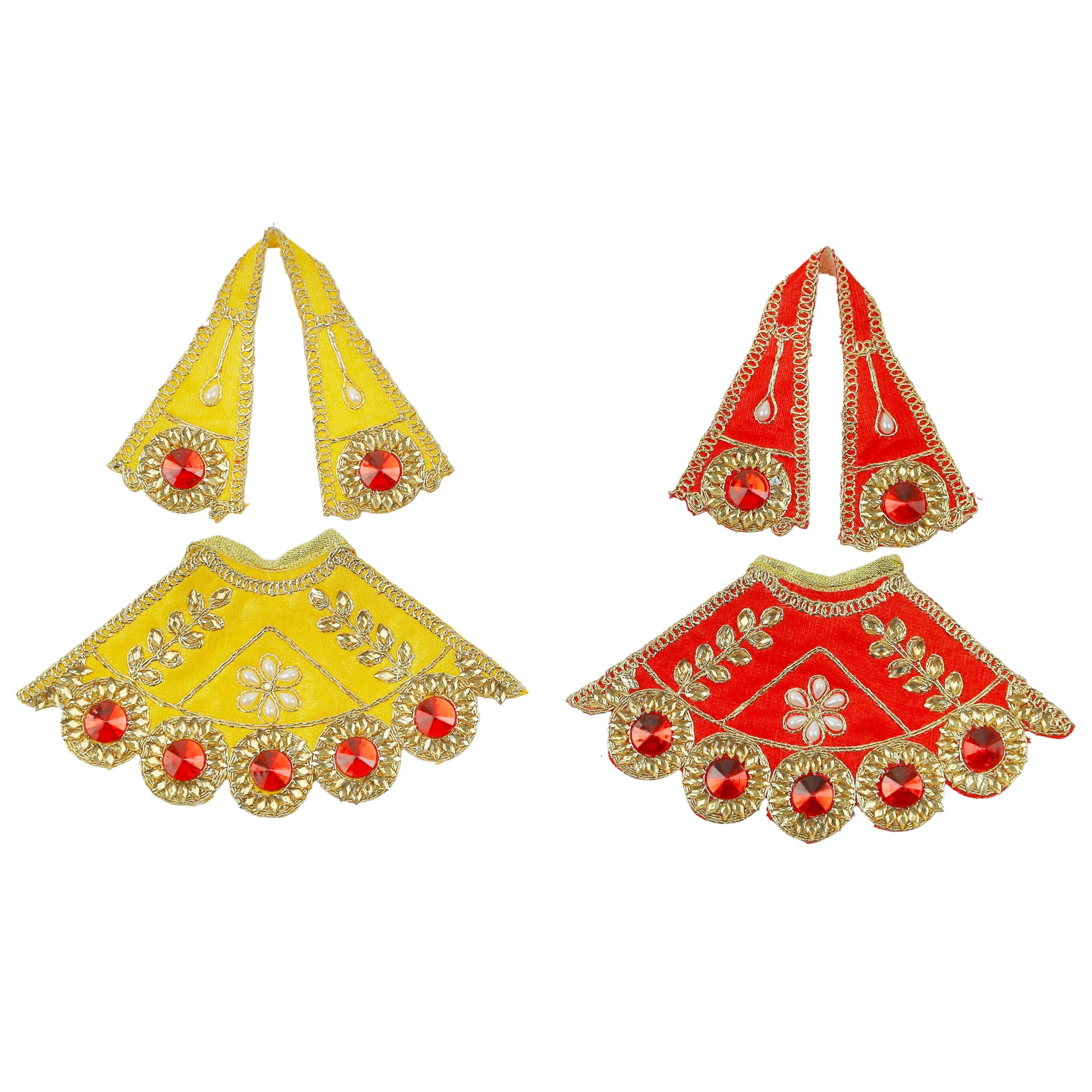 Diese wunderschönen Puja-Kleider sind eine traditionelle Ehrerbietung an die Göttinnen Laxmi und Durga. Im Set sind 2 komplette Outfits in Rot und Gelb - die Farben des Glücks und der Energie. Jedes Set besteht aus einem Lehanga (7 Zoll lang, 14 Zoll breit) und einem Dupatta/Chunari (16 Zoll). Hergestellt aus Kunstseide - leicht, glänzend und mit aufwendigen Verzierungen. Perfekt für kleine Göttinnen-Statuen bis 7 Zoll Größe. Wird traditionell zu besonderen Anlässen wie Navratri, Diwali oder Haussegnungen verwendet. Die feine Verarbeitung und die lebendigen Farben machen jede Haus-Puja zu einem besonderen Erlebnis. Ein Stück indische Tradition für dein Zuhause!