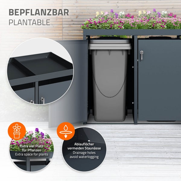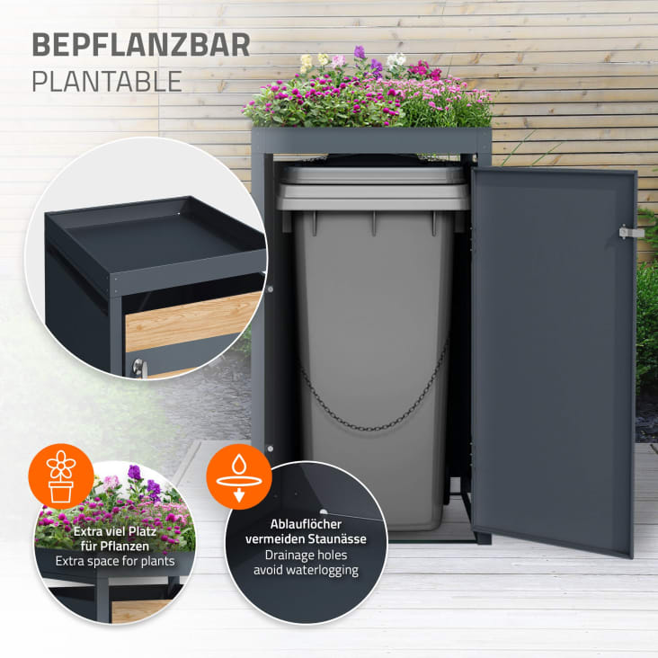 Schluss mit unschönen Mülltonnen im Vorgarten! Diese coole Mülltonnenbox von ML-Design versteckt deine 240L-Tonne perfekt. Aus robustem Stahl mit Pulverbeschichtung in Anthrazit - hält ewig und rostet nicht. Das integrierte Pflanzdach ist der Hit: Da kannst du Kräuter, Bodendecker oder kleine Blumen pflanzen. Mit 68x80x124cm passt sie für alle gängigen Tonnen (60L, 120L, 240L). Luftzirkulation verhindert schlechte Gerüche, und das Schließsystem mit 2 Schlüsseln hält neugierige Tiere fern. Einfach aufbauen und mit den Bodenblechen fixieren. Super praktisch: Du kannst mehrere Boxen miteinander verbinden für Mülltrennung. Sieht nicht nur ordentlich aus, sondern macht deinen Garten gleich viel schöner! Perfekt für Haus, Garten oder Wohnanlagen - endlich keine unschönen Mülltonnen mehr im Blick.