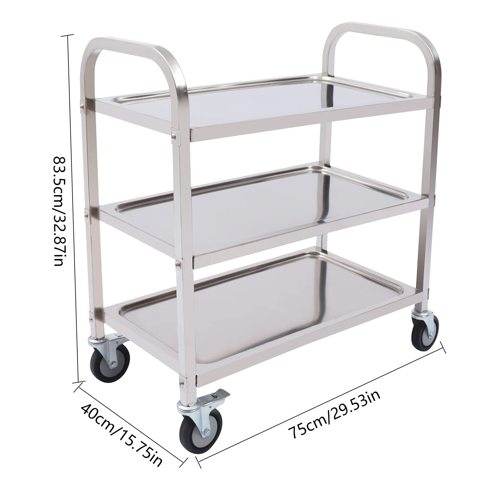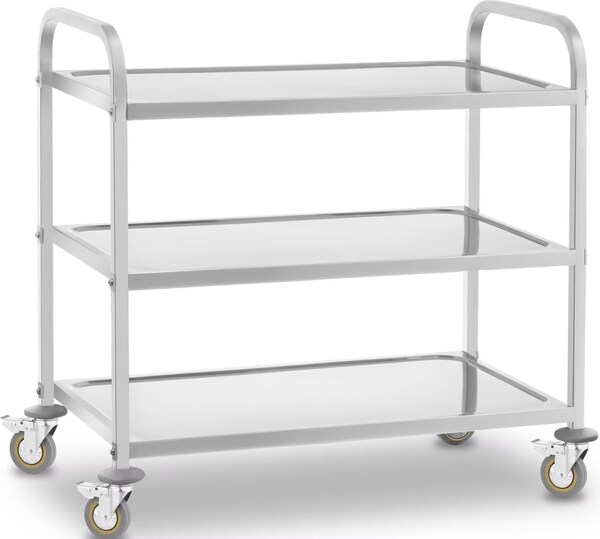 Profiqualität für Gastronomie und Zuhause! Dieser stabile Servierwagen aus Edelstahl macht das Servieren und Transportieren zum Kinderspiel. Mit 3 praktischen Ablagen und leichtlaufenden Rädern.\\n\\n✅ Maße: 625x315x800mm (LxBxH)\\n✅ 3 Anti-Schock-Böden mit Gummimatten\\n✅ 4 Leichtlaufrollen mit 2 Feststellbremsen\\n✅ Vierkantrohr-Gestell für optimalen Halt\\n✅ Aus hochwertigem Edelstahl\\n\\nDie Anti-Vibrationsmatten reduzieren Geräusche und schützen das Transportgut. Die Feststellbremsen sorgen für Sicherheit beim Stehenbleiben. Durch die Griffe am Gestell lässt sich der Wagen super manövrieren.\\n\\nOb in der Küche, beim Catering oder für die Hausbar - dieser Wagen ist ein echter Allrounder. Robust, hygienisch und total praktisch. Ein Arbeitsgerät, auf das du dich verlassen kannst!