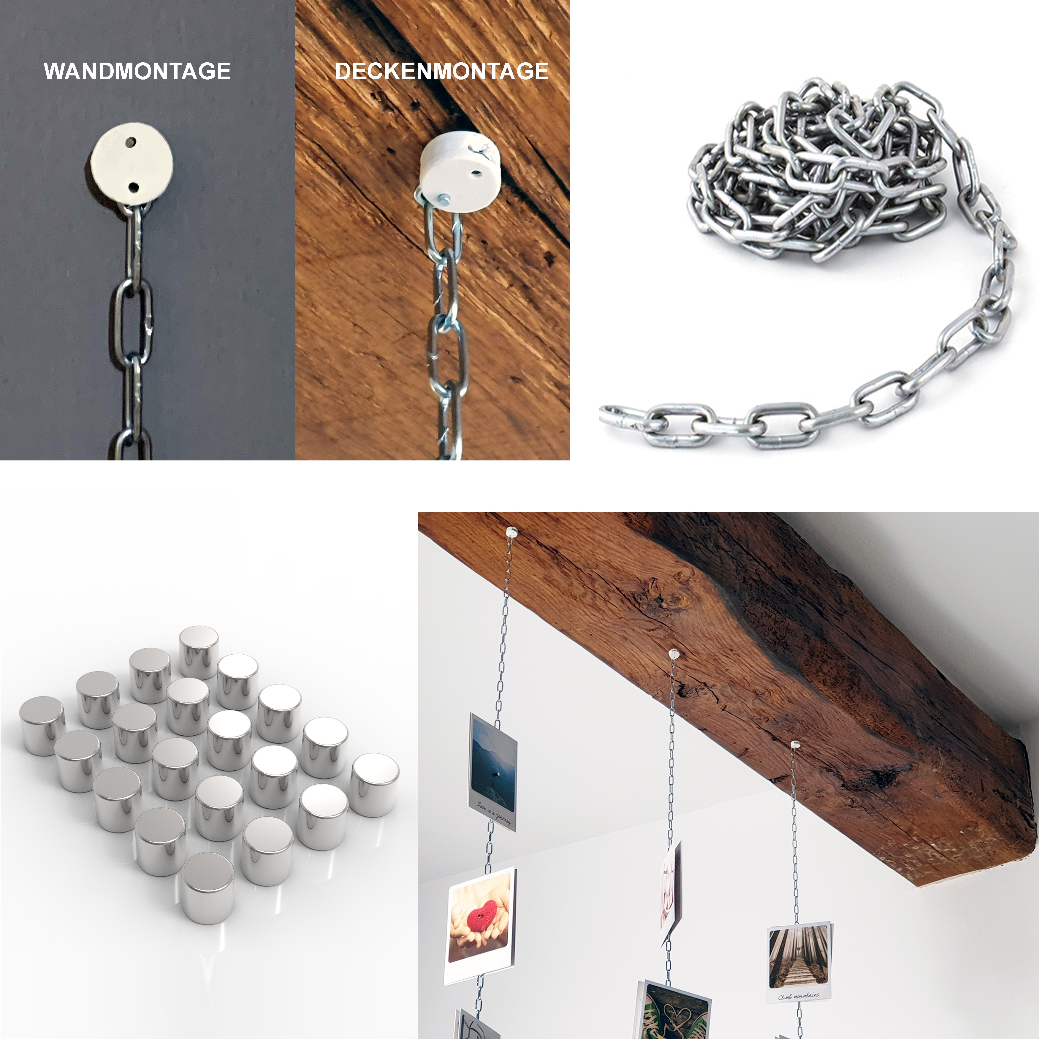 Gestalte deine Wandgalerie ganz ohne Löcher! Dieses Fotodrahtseil mit Magneten ist die perfekte Lösung. \\n\\nIm Set: 4 Seile à 2 Meter Länge und 48 Magnete - genug für viele Fotos! \\n\\nEinfache Montage: Seil an der Wand befestigen, Magnete an Bilder kleben - fertig! \\n\\nMit Stahlkugeln - lassen sich leicht verschieben für die perfekte Anordnung. \\n\\nSeil-Durchmesser: 1,2 mm - stabil aber unauffällig. \\n\\nPerfekt für: \\n- Fotos und Postkarten \\n- Kunstwerke \\n- Kinderzeichnungen \\n- Urlaubserinnerungen \\n\\nEinfach zu ändern: Bilder tauschen ohne Aufwand - immer wieder neue Galerien! \\n\\nFür Zuhause, Büro oder Galerien - moderne Wanddekoration mal anders! \\n\\nHol dir die flexibelste Bilderwand ever - ohne Bohren, ohne Kleben!