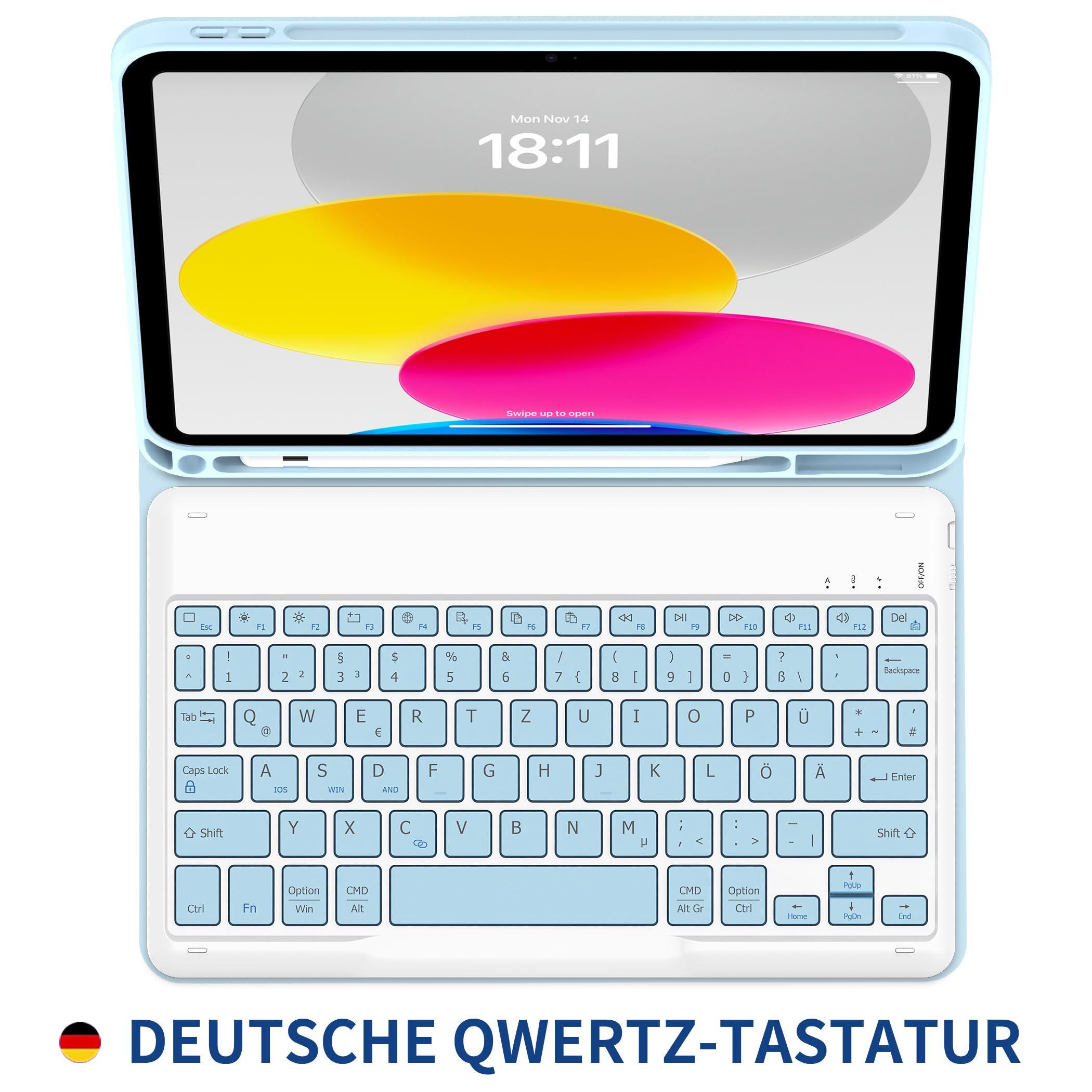 Verwandle dein iPad im Handumdrehen in einen vollwertigen Laptop! Diese coole Tastatur-Hülle von EasyAcc ist speziell für das iPad 11 (A16) und 10 Generation (2025/2022) gemacht. Die magnetische Tastatur lässt sich ganz einfach abnehmen und wieder anbringen - super praktisch! Mit 3 verschiedenen Neigungswinkeln findest du immer die perfekte Position zum Arbeiten, Lesen oder Videos schauen. Extra Bonus: Integrierter Stifthalter für deinen Apple Pencil (Stift nicht im Lieferumfang). Die Tastatur reagiert blitzschnell und hat praktische Shortcut-Tasten. Das wabenförmige Design auf der Rückseite sorgt für optimale Wärmeableitung. Aus hochwertigem TPU-Material gefertigt, schützt sie dein iPad zuverlässig vor Stößen und Kratzern. Kompatibel mit A2696, A2757, A2777, A3162, A3354, A3355, A3356. Perfekt für Studenten, Beruf und kreative Arbeiten!
