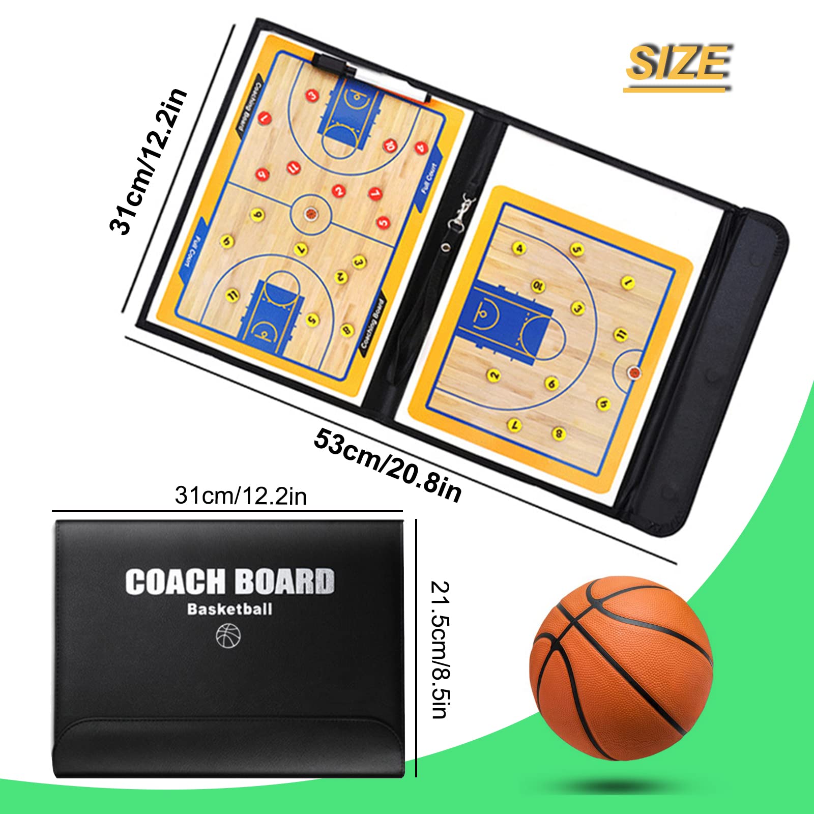 Mit 241x175 mm genau die richtige Größe für unterwegs. Inklusive Stift, Handtasche und magnetischen Schachfiguren. Perfekt für Trainer, Basketball-Begeisterte oder im Schulunterricht. Mach dein Team zur unschlagbaren Mannschaft!