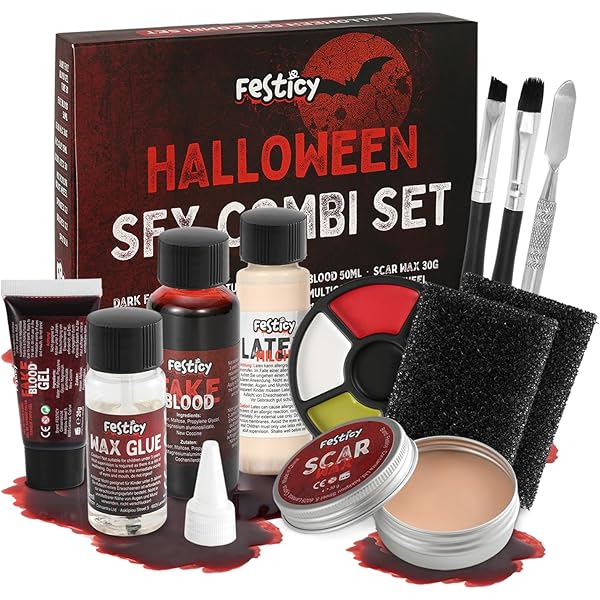 Werde zum Grusel-Experten mit diesem mega Komplett-Set von Festicy! Enthalten ist alles, was du für schockierend echte Horror-Looks brauchst: 50 ml flüssiges Kunstblut, 20 g Gel-Kunstblut für 3D-Effekte, 30 g Narbenwachs, 15 ml Wachsleim und 30 ml flüssigen Latex. Dazu eine Farbpalette für Blutergüsse, zwei Schwämme, zwei Pinsel und einen Spatel. Einfach anzuwenden mit der beiliegenden Anleitung - auch für Anfänger geeignet. Die Materialien sind hautfreundlich und auswaschbar. Kreiere offene Wunden, blutige Narben oder gruselige Verletzungen. Perfekt für Halloween-Partys, Kostümfeste oder Theateraufführungen. Aber Vorsicht: Nicht für Kinder unter 12 Jahren und Latex kann allergische Reaktionen hervorrufen. Unter Aufsicht verwenden! Damit wirst du zum Star jeder Grusel-Party!