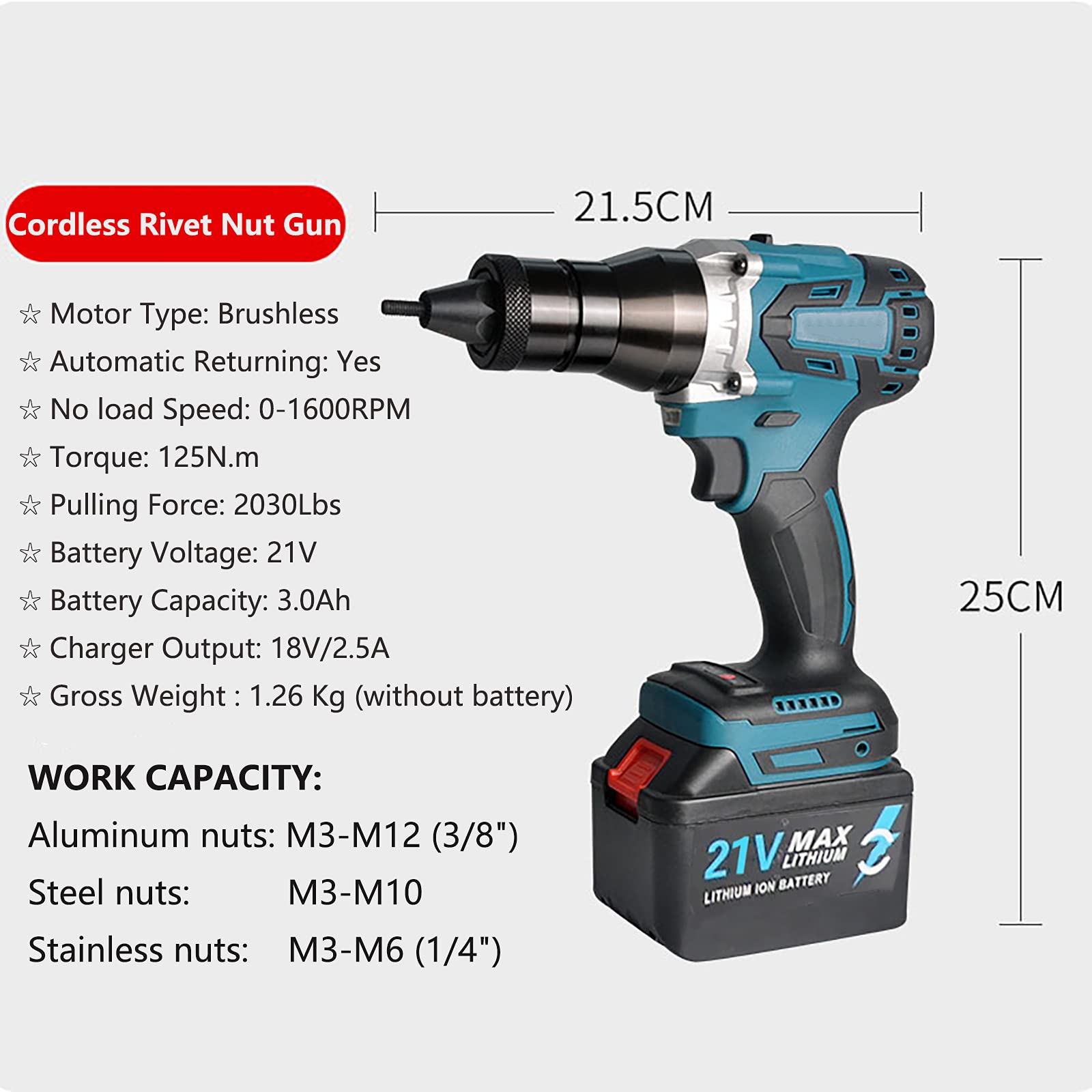 Diese geniale 2-in-1 Akku Maschine ist sowohl Nietmutter- als auch Nietpistole in einem! Kompatibel mit Makita 18V Akkus (ohne Akku im Lieferumfang). Einfach Kopf wechseln und zwischen den Funktionen switchen. Als Mutternzange für M3 bis M12 Muttern, als Nietpistole für 2.4-4.8mm Alu- und Edelstahlnieten. Mit bürstenlosem Motor, zwei Geschwindigkeitsstufen und LED-Arbeitslicht. Ergonomischer Griff, selbstverriegelnder Kopf. Perfekt für Wohnmobile, Boote oder Metallarbeiten. Endlich kabellos und flexibel arbeiten!