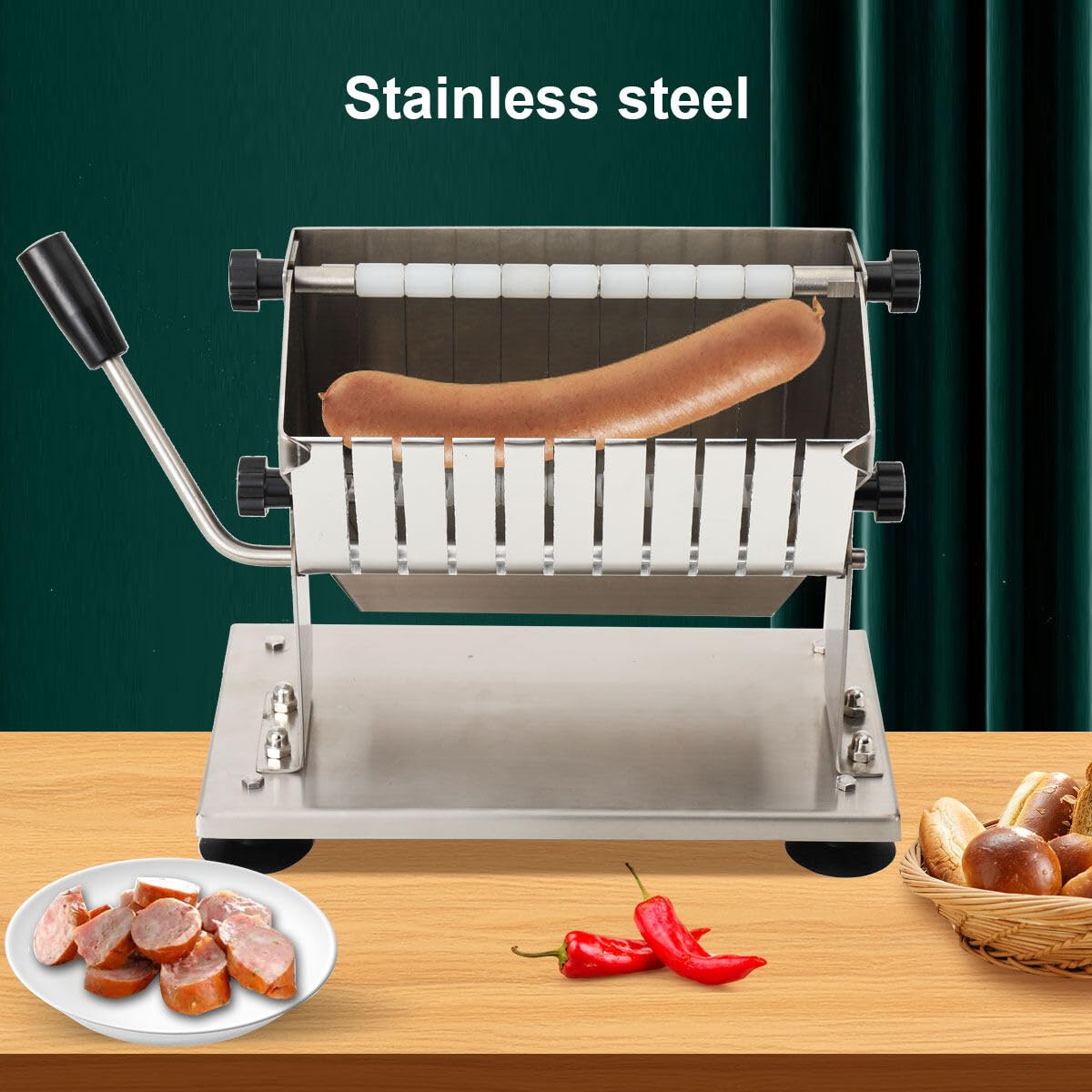 Aus robustem Edelstahl AISI 304 gebaut, hält das Teil ewig. Mit 7 kg Gewicht steht es bombenfest auf der Theke. Perfekt nicht nur für Currywurst, sondern für alle Wurstsorten.