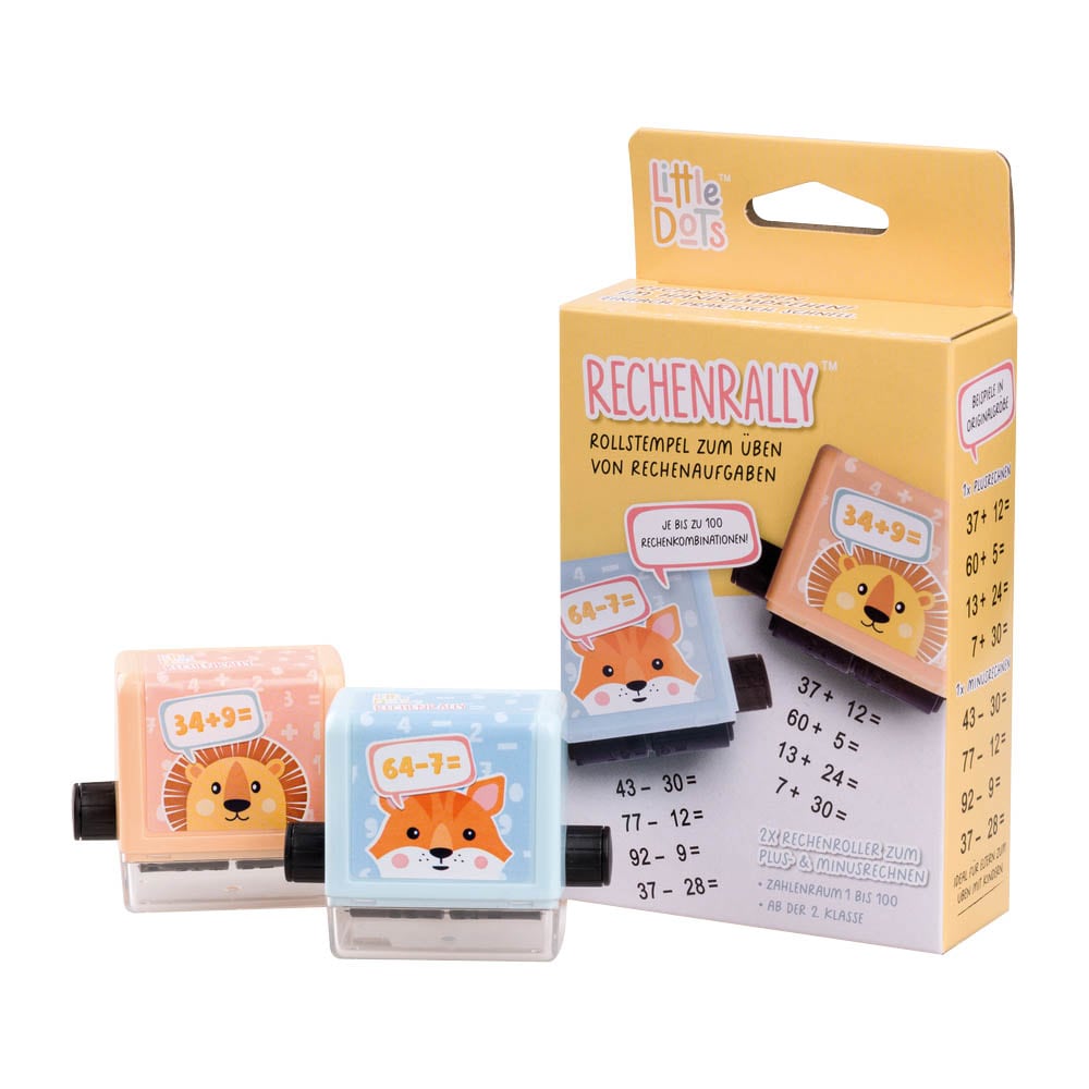 Mathe macht plötzlich Spaß! Mit dem Trodat Little Dots Rechenrally Rollstempel verwandelst du langweilige Rechenübungen in ein spannendes Spiel. Dieser geniale selbstfärbende Stempel erzeugt bis zu 100 verschiedene Rechenkombinationen im Zahlenraum von 1 bis 100 - einfach durch Drehen variieren und über das Papier rollen! Perfekt für Kinder ab der 2. Klasse, die das Addieren, Subtrahieren oder Multiplizieren üben sollen. Der Stempel ist sofort einsatzbereit, mit schwarzem Abdruck und praktischer Abdeckkappe für saubere Aufbewahrung. Über 100 Meter Abdrucklänge garantieren lang anhaltenden Übungsspaß. Lehrer und Pädagogen schwören auf diese innovative Methode, um Kindern spielerisch Mathematik näherzubringen. Eine tolle Alternative zu Rechenschiebern, Rechenketten oder Würfeln - und ein perfektes Geschenk zur Einschulung oder für die Schultüte. Hergestellt von Trodat, dem größten Stempelhersteller der Welt mit über 100 Jahren Erfahrung. Die umweltfreundliche Kartonverpackung kommt ohne Plastik aus. Ob zu Hause mit den Eltern oder in der Schule - mit diesem Rollstempel wird Rechnen lernen zum Kinderspiel. Hol dir die Motivation zurück in den Lernalltag!