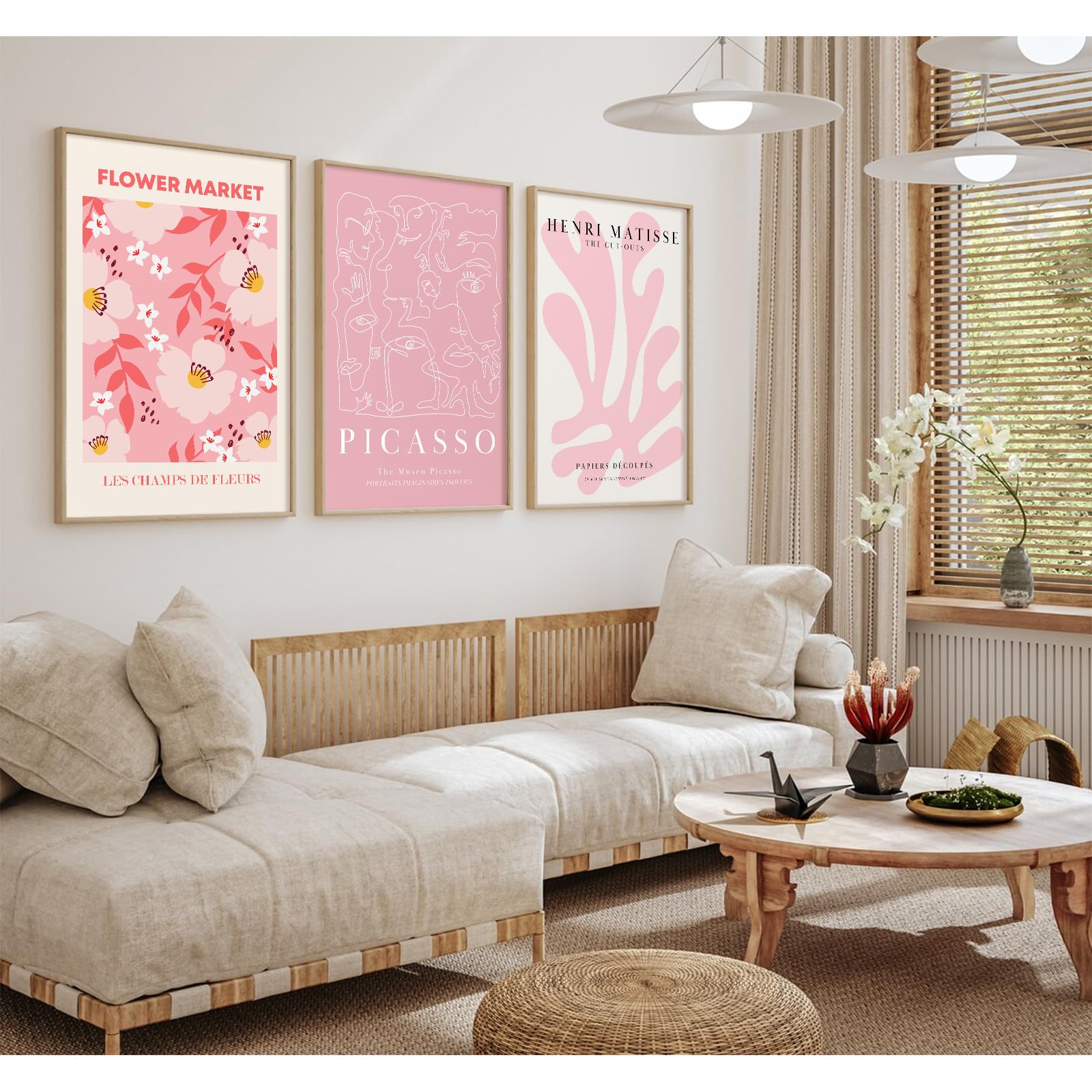 Bring Farbe in deine vier Wände! Dieses 3-teilige Wandbild-Set im Matisse-Stil verwandelt jeden Raum in eine Galerie. Sanfte Rosa- und Lavendeltöne schaffen eine entspannte Atmosphäre. Jedes Bild misst 30x40cm - perfekt für Wohnzimmer, Schlafzimmer oder Flur. Hochwertiger Leinwanddruck auf Holzrahmen, vormontierte Aufhänger machen die Montage super einfach. Passt zu minimalistischem, skandinavischem oder Boho-Einrichtungsstil. Ein echter Hingucker, der sofort gute Laune macht!