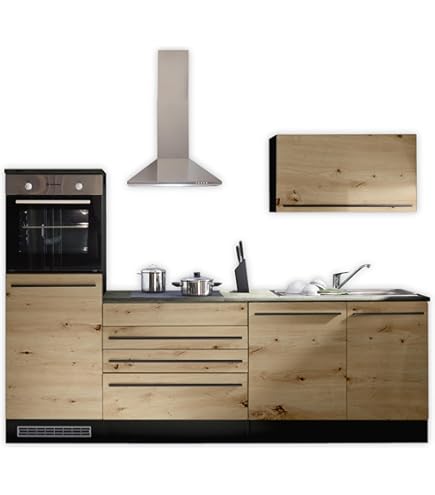 Traumküche zum Selberaufbauen! Diese moderne Eckküche in schwarz matt sieht nicht nur super stylisch aus, sondern hat auch alles dabei, was du brauchst. Inklusive Einbaubackofen, Dunstabzugshaube, Glaskeramikkochfeld und Geschirrspüler - einfach alles aus einer Hand. Die Arbeitsplatte in Lanzelot Eiche-Optik bringt wohnliche Wärme in deine Küche. Mit den Maßen 220 x 211 x 60 cm (B/H/T) bietet sie reichlich Stauraum und eine großzügige Arbeitsfläche. Das Schubkastensystem mit Unterführung ist mega praktisch und die Arbeitshöhe von etwa 90 cm angenehm zum Arbeiten. Der Clou: Sie kann sowohl links als auch rechts montiert werden und passt sich so deinen Raumverhältnissen an. Die Aufbauanleitung ist detailliert und auch für Anfänger geeignet. Von Stella Trading - da weißt du, dass Qualität dahintersteckt!