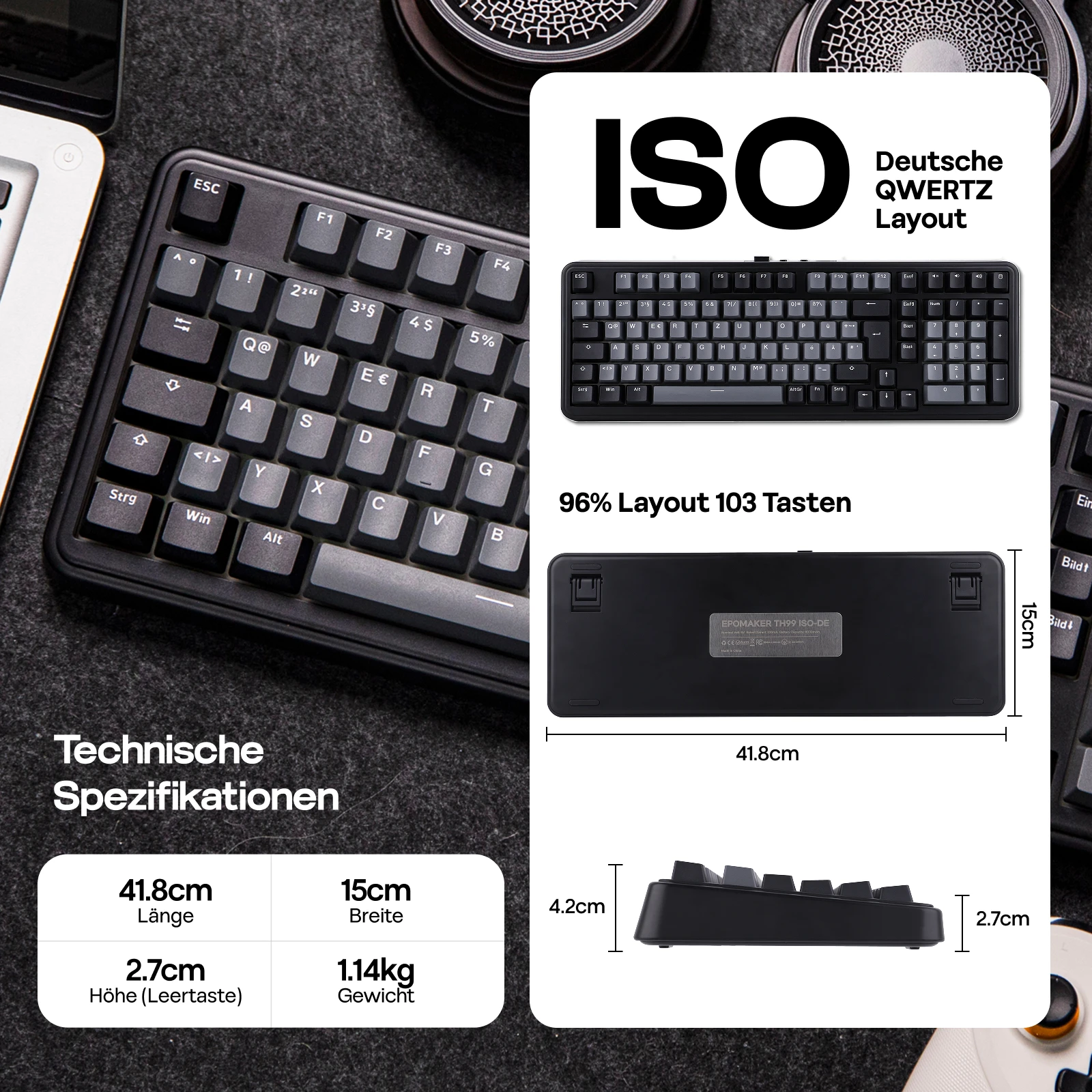 Hey, suchst du eine richtig gute mechanische Tastatur? Die EPOMAKER TH99 ist genau das, was du brauchst! Mit deutschem QWERTZ-Layout und 96% Größe hast du alles, was du brauchst - inklusive Numpad, aber platzsparend. Sie ist kabellos mit BT 5.0, 2.4GHz und USB-C - also total flexibel. Der mega Akku (8000mAh) hält bis zu 800 Stunden! Die Gasket-Mount Bauweise macht das Tippgefühl super weich und leise, und die vorgeölten Creamy Jade Switches (linear, 45gf) fühlen sich einfach butterweich an. Dazu kommt RGB-Beleuchtung, die du komplett anpassen kannst. Hot-Swap-fähig ist sie auch, falls du mal die Switches wechseln willst. Perfekt für Gaming, Arbeit oder einfach nur zum Tippen - die TH99 rockt einfach jeden Einsatz!