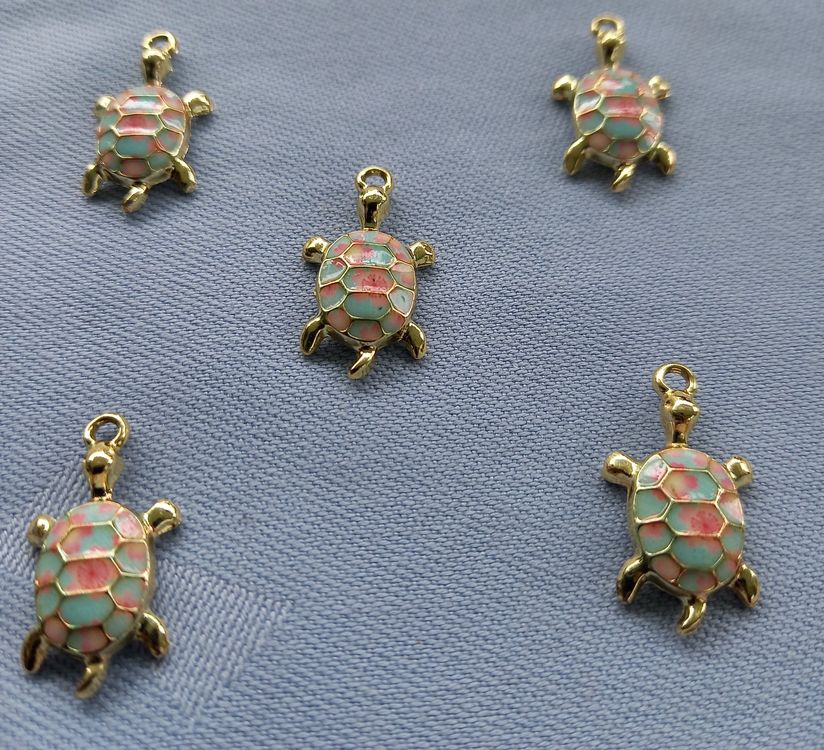 Kreativ werden mit diesen niedlichen Meeresschildkröten! Dieses Set mit 20 Anhängern in zufälligen Farben ist perfekt für deine Schmuck-Projekte. Jeder Anhänger misst ca. 17x13 mm und hat ein 4 mm Loch zum einfachen Aufziehen. Aus vergoldetem Messing mit Emaille-Oberfläche und funkelnden Zirkonia-Steinchen - das sieht einfach hochwertig aus! Super für Armbänder, Halsketten, Ohrringe oder Schlüsselanhänger. Die kleine Öse macht das Verarbeiten total einfach - einfach durchfädeln und fertig! Ob für dich selbst oder als Geschenk für Freundinnen - mit diesen süßen Schildkröten kreierst du einzigartigen Schmuck. Einfach deiner Kreativität freien Lauf lassen und tolle Unikate erschaffen! Perfekt für Bastelabende oder wenn du mal wieder was Neues ausprobieren willst.