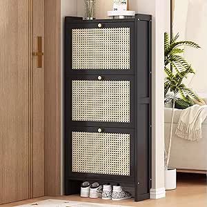 Schluss mit Schuhchaos im Flur! Dieser wunderschöne Schuhschrank aus Rattan bietet Platz für alle deine Schuhe. Mit 5 verstellbaren Einlegeböden - perfekt für Ballerinas, Turnschuhe, High Heels oder Stiefel. Maße: 68x38x88cm - kompakt aber geräumig. Die zwei Rattantüren im Bohemian-Stil sehen nicht nur gut aus, sondern verstecken auch Unordnung. Aus stabilen Holzplatten mit integriertem Beinrahmen - absolut kippsicher. Mit Anti-Kipp-Set für zusätzliche Sicherheit (besonders wichtig mit Kindern oder Haustieren). Die Oberfläche ist schmutzabweisend und leicht zu reinigen. Oben gibt's extra Ablagefläche für Schlüssel, Taschen oder Deko. Einfache Montage mit nummerierten Teilen und Anleitung. Passt perfekt in den Eingangsbereich, Flur oder sogar ins Schlafzimmer. In warmem Braunton - ein echter Hingucker! Hol dir jetzt Ordnung und Stil!