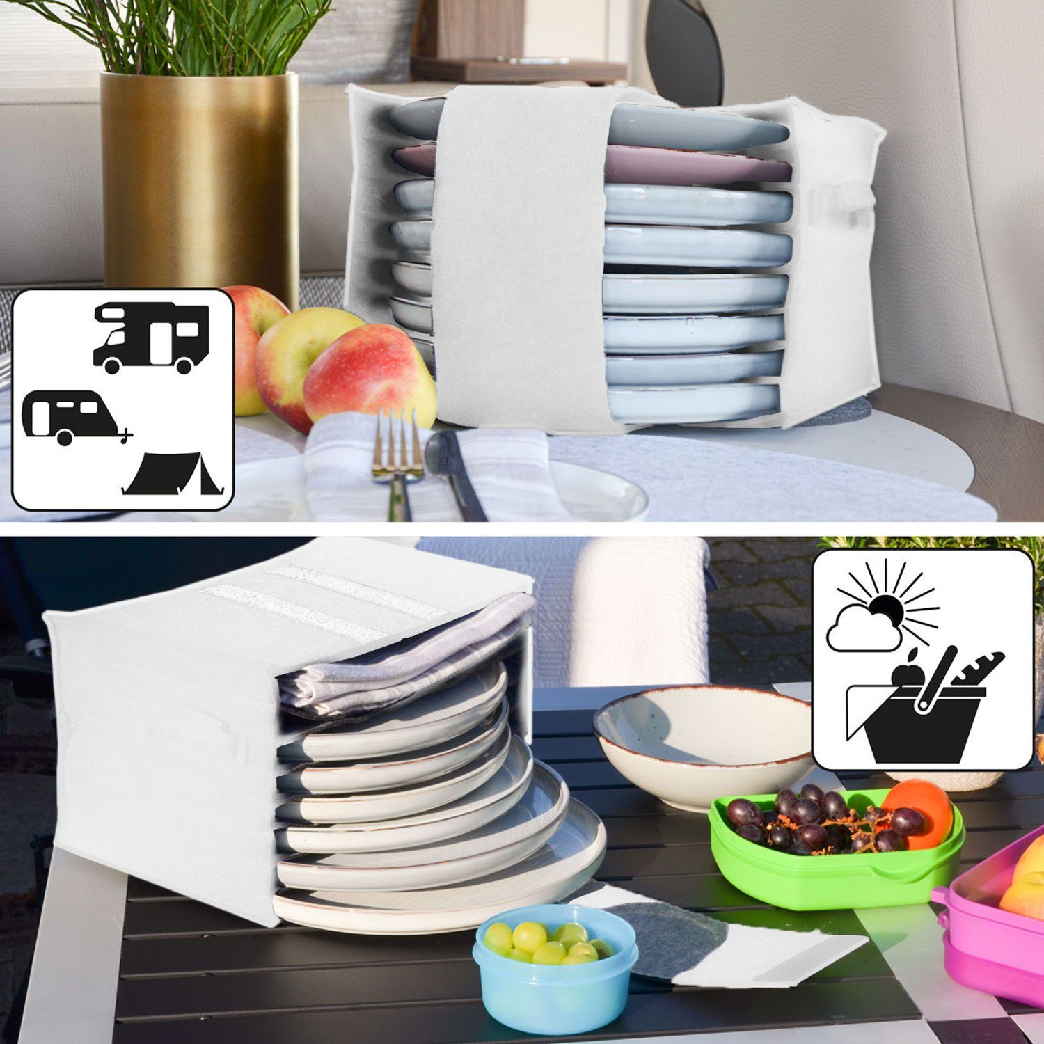Perfekt für Camper, Wohnmobil-Fans und Outdoor-Enthusiasten! Dieser praktische Geschirr-Trockenbeutel bringt Ordnung in deine Camping-Küche. Einfach das nasse Geschirr rein, aufhängen und trocknen lassen!\n\nWas diesen Beutel so genial macht:\n• Aus robustem Oxford-Mesh - reißfest und langlebig\n• Maße: 55 x 40,5 cm - Platz für reichlich Geschirr\n• Integrierte Aufhängung - einfach an Bäumen oder Zelten befestigen\n• Faltbar - wird nur 33 x 23 x 2 cm klein\n• Leicht - nur 293 Gramm\n\nDer Mesh-Stoff sorgt für optimale Belüftung, sodass Teller, Tassen und Besteck schnell trocknen. Mehrere Fächer helfen beim Sortieren, und die verstärkten Tragegurte machen das Handling super einfach. Ob beim Camping, Picknick oder im Garten - dieser Beutel ist dein bester Helfer!
