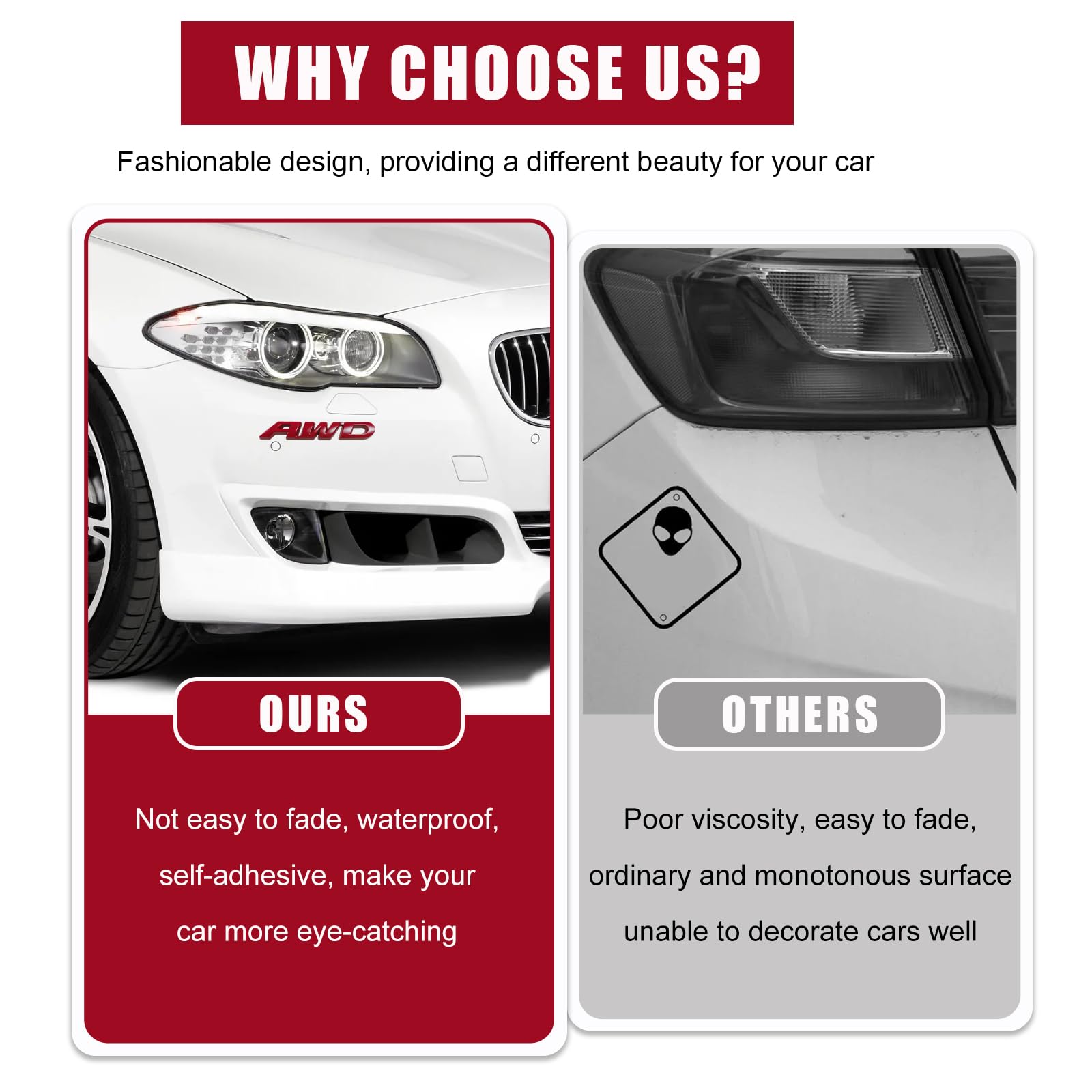 Hey, willst du deinem Auto mehr Style verpassen? Dieses AWD Emblem ist genau das Richtige! Aus hochwertiger Aluminiumlegierung - kein billiges Plastik. Das 3D Design sieht einfach premium aus und gibt deiner Front oder Motorhaube nen individuellen Look. Einfach zu montieren - wird mit Schrauben und Muttern geliefert. Hält bombenfest, auch bei Regen und Wind. Perfekt für alle die Allrad-Fahrzeuge haben und das auch zeigen wollen. Die Verarbeitung ist top, scharfe Kanten gibt's nicht. Macht aus jedem Auto was Besonderes - ob SUV, Geländewagen oder Sportwagen. Einfach anbringen und sich über den neuen Look freuen! Qualität die man sieht - das Emblem glänzt schön und verblasst nicht. Für innen und außen geeignet. Kleiner Aufwand, große Wirkung - dein Auto wird sofort aufgewertet!