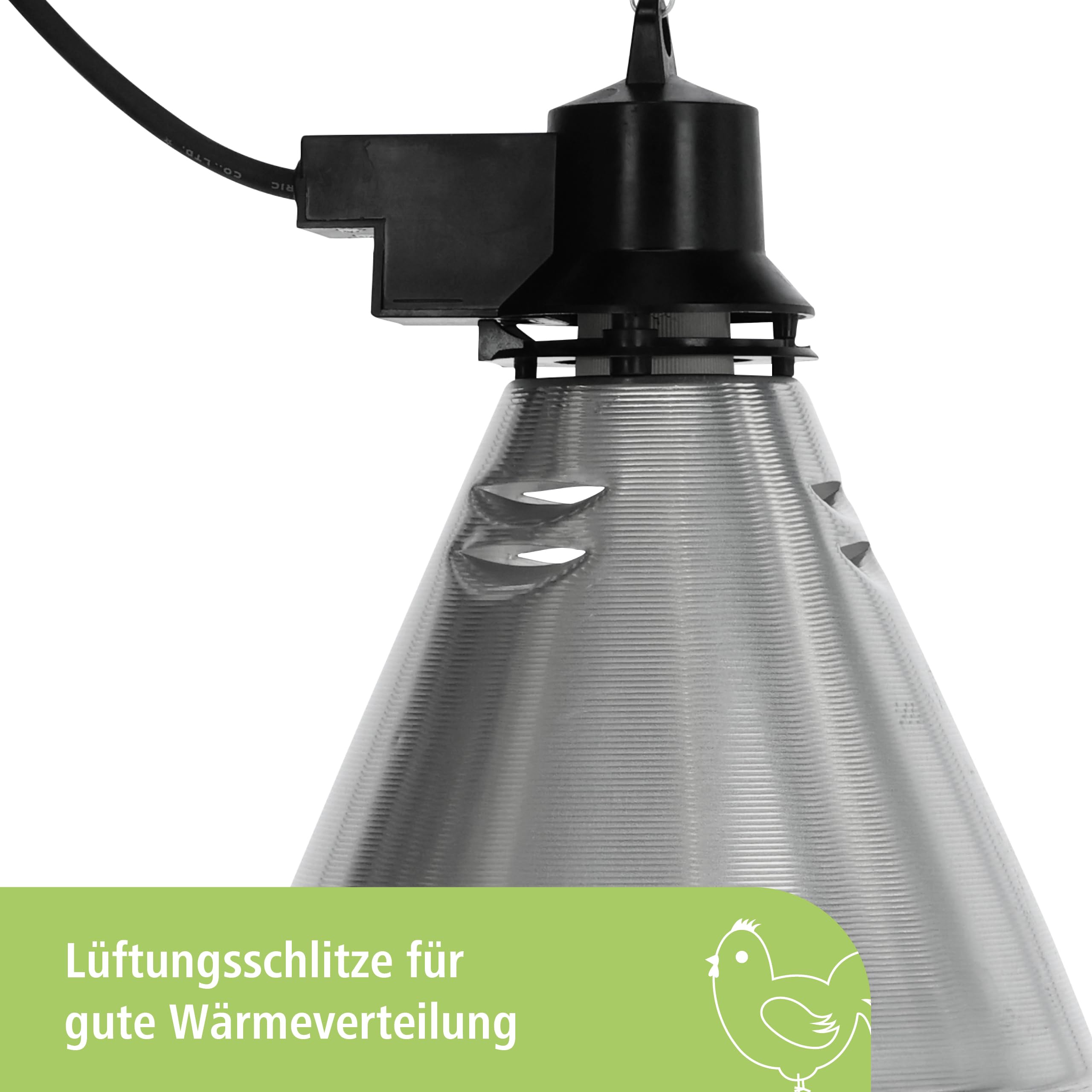 Sicherheit und Wärme für deine Tiere! Diese robuste Metall-Abdeckung für Wärmelampen schützt sowohl die Lampe als auch deine Tiere vor Verbrennungen. Perfekt für Hühnerställe, Schweineställe, Schafställe oder auch für Reptilien-Terrarien. Die glatte, gebrannte Lackoberfläche verbessert die Wärmeverteilung und sorgt für gleichmäßige Temperaturen in deinem Stall. Das wasserdichte Design macht die Abdeckung auch bei Feuchtigkeit absolut sicher und funktionsfähig. Mit den Maßen 29,5x29,5x4,5 cm passt sie für die meisten Standard-Wärmelampen. Die Installation ist denkbar einfach - einfach die Glühbirne einsetzen, Abdeckung montieren und in wenigen Minuten ist alles betriebsbereit. Das Metall hält auch hohen Temperaturen problemlos stand und ist damit ideal für den Dauerbetrieb. Deine Tiere bleiben warm und geschützt, während du dir keine Sorgen um Brandgefahr machen musst. Ein unverzichtbares Zubehör für jede Tierhaltung - ob in der Landwirtschaft oder für private Tierliebhaber. Für mehr Sicherheit und Komfort in deinem Stall!