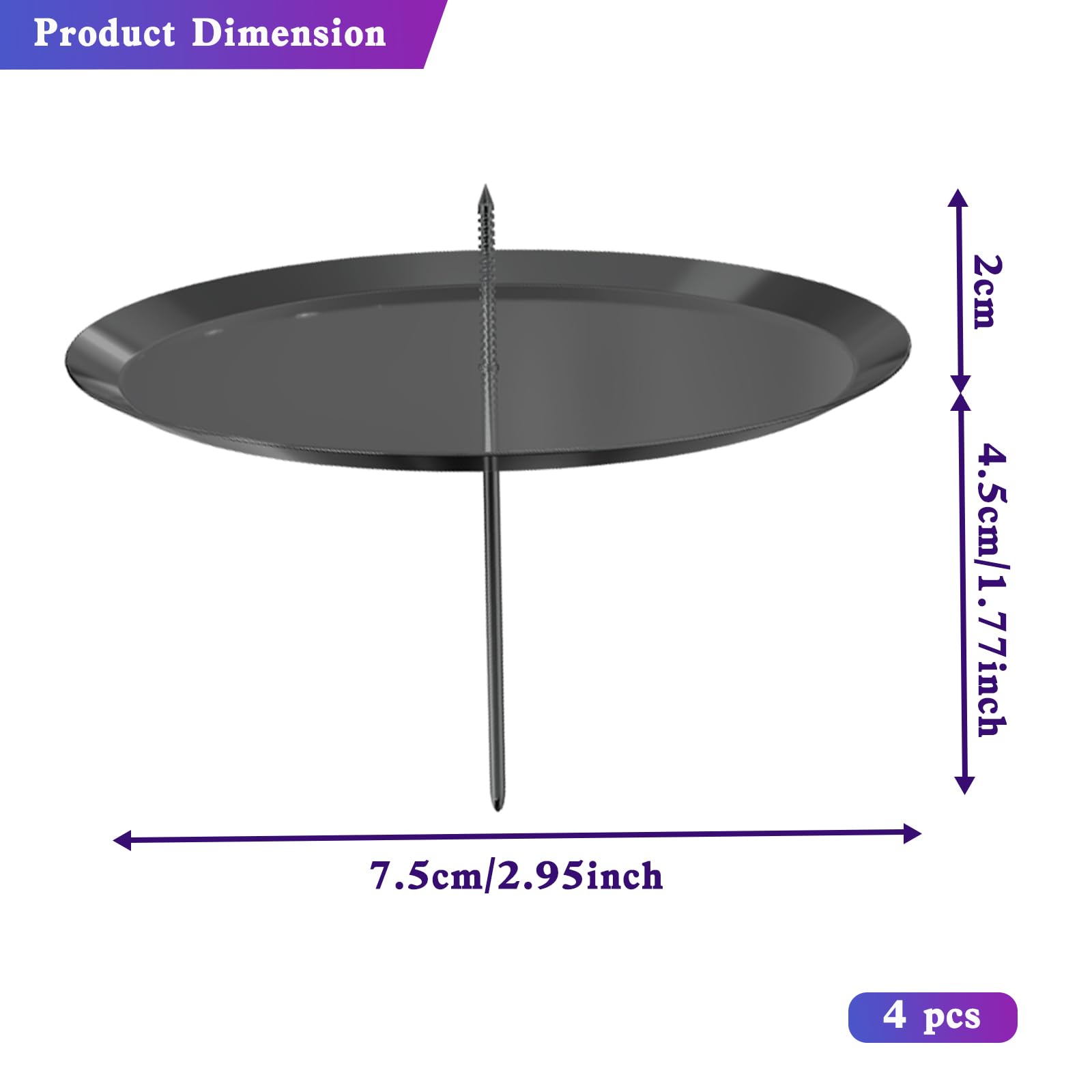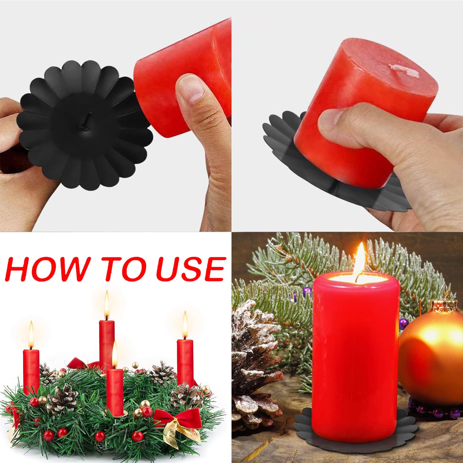 Perfekte Vorbereitung auf die Weihnachtszeit! Diese 4 praktischen Kerzenhalter aus robustem Metall machen deinen selbstgemachten Adventskranz erst komplett. Mit 7,5 cm Durchmesser und 2 cm langem Dorn halten sie selbst große Stumpenkerzen sicher fest. Der aufgewölbte Rand verhindert, dass Wachs auf deinen schönen Kranz tropft - super praktisch! Einfach ein kleines Loch vorlochen und der Halter sitzt bombenfest. Übrigens: Die Halter sind nicht nur für Weihnachten geeignet, sondern auch für Frühlingskränze, Hochzeitsdeko oder Trockenblumenarrangements. Mach deine Deko zu jedem Anlass besonders! Lieferumfang: 4 Kerzenhalter in Schwarz. Material: Metall. Durchmesser: ca. 7,5 cm. Dornlänge: ca. 2 cm. Nadel: ca. 4,5 cm. Tipp für perfekten Halt: Vor dem Einsetzen der Halter ein kleines Loch in den Kranz bohren - dann sitzt alles fest und sicher.