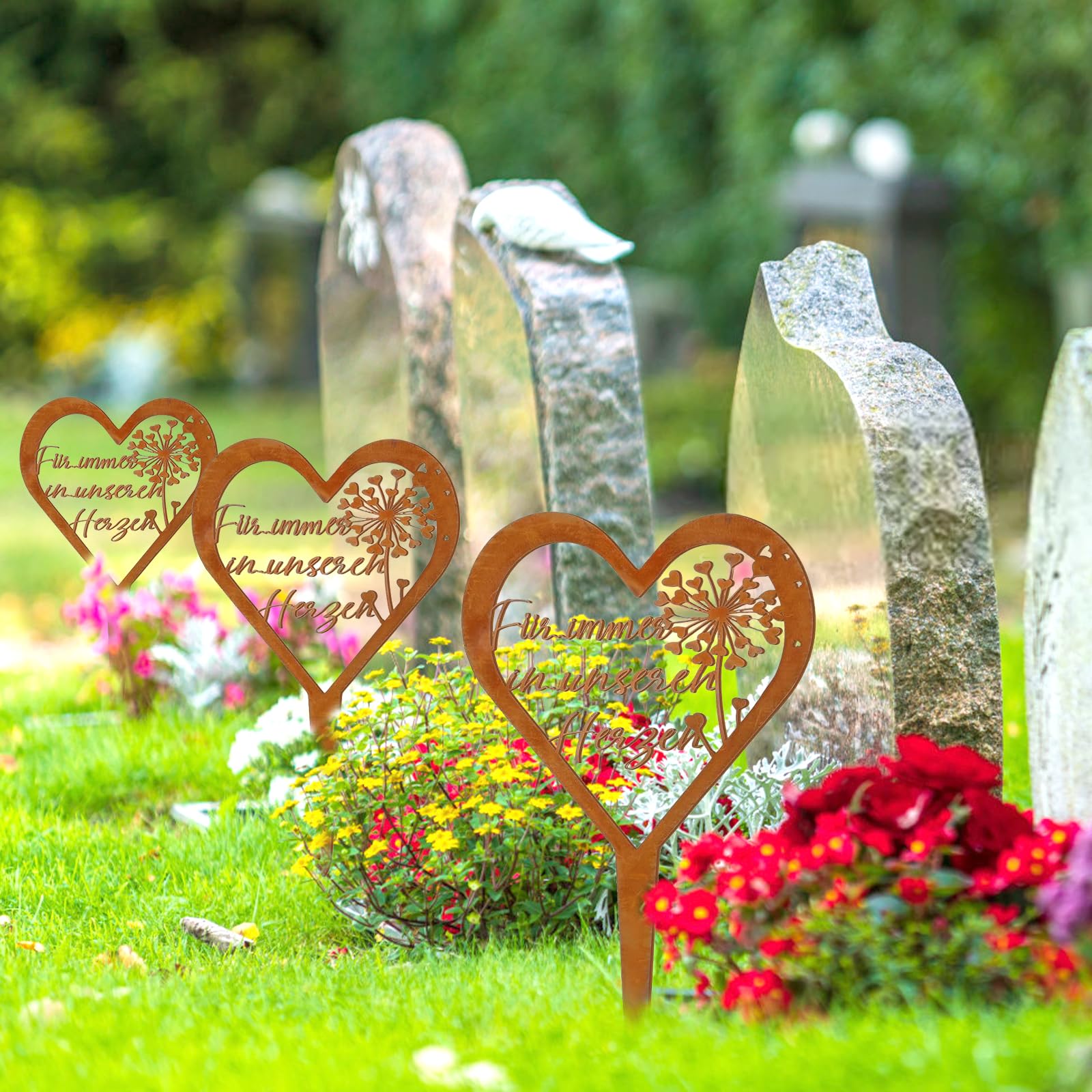Eine wunderschöne Art, an liebe Verstorbene zu erinnern. Dieser Grabstecker in Herzform aus Metall trägt die berührende Aufschrift 'Immer in unseren Herzen'. Mit zartem Löwenzahn-Motiv - ein Symbol für warme Erinnerungen und tiefe Verbundenheit. Maße: 28x18cm, also schön groß und gut sichtbar. Aus hochwertigem, wetterfestem Metall das nicht rostet - hält auch bei schlechtem Wetter lange. Der lange Stab wird einfach in die Erde gesteckt und bleibt auch bei Wind stabil stehen. Perfekt für Gräber, Gärten, Höfe oder Balkone. Eine würdevolle Art, Trauer auszudrücken und die Erinnerung an geliebte Menschen wachzuhalten. Ob als Hauptdekoration oder als Ergänzung zu bestehenden Grabsteinen - dieses Herz berührt jedes Mal aufs Neue. Ein tröstliches Zeichen der Liebe, das für die Ewigkeit gemacht ist.