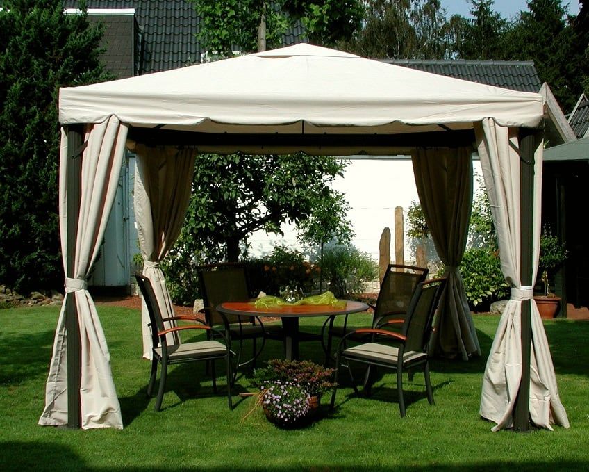 Das Walmdach-Design mit den raffbaren Seitenwänden sieht total mediterran aus und sorgt für Urlaubsfeeling im eigenen Garten. Aus robustem 50mm Stahlrohr gefertigt, steht der Pavillon bombenfest. Die Polyester-Plane ist 100% wasserdicht durch PVC-Beschichtung.