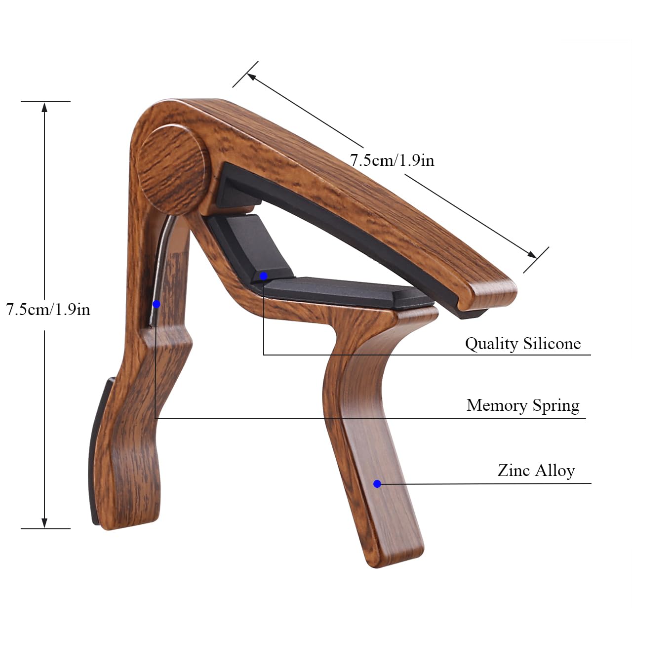 Dein vielseitiger Begleiter für die Gitarre! Dieser praktische Kapodaster von Mihauuke wurde speziell für Akustikgitarren mit Nylonsaiten entwickelt und überzeugt durch seine einfache Handhabung und vielseitigen Funktionen. Mit einstellbarer Spannung sorgt er für einen perfekten Halt auf dem Gitarrenhals und eine präzise Tonhöhenkontrolle über alle Bünde hinweg. Das kompakte Design (ca. 8x9cm) macht ihn zum idealen Reisebegleiter. Besonders praktisch: Der integrierte Plektrumhalter sorgt dafür, dass du deine Plektren immer griffbereit hast. Im Lieferumfang sind gleich 6 verschiedene Gitarrenplektren (ca. 0,1cm Dicke) enthalten. So hast du alles, was du für deine musikalische Performance brauchst. Der Kapodaster eignet sich nicht nur für Akustikgitarren, sondern auch für E-Gitarren und Ukulelen, was ihn zu einem echten Allrounder macht. Perfekt für Gitarren-Anfänger, die verschiedene Stimmungen ausprobieren wollen, aber auch für erfahrene Musiker, die bei Live-Auftritten schnell zwischen verschiedenen Tonarten wechseln müssen. Die zuverlässige Funktion bei unterschiedlichen Musikstilen macht ihn zum unverzichtbaren Zubehör für jede Gitarrentasche. Einfach aufsetzen, festziehen und schon erklingt deine Gitarre in neuer Tonart - ohne umständliches Umstimmen!