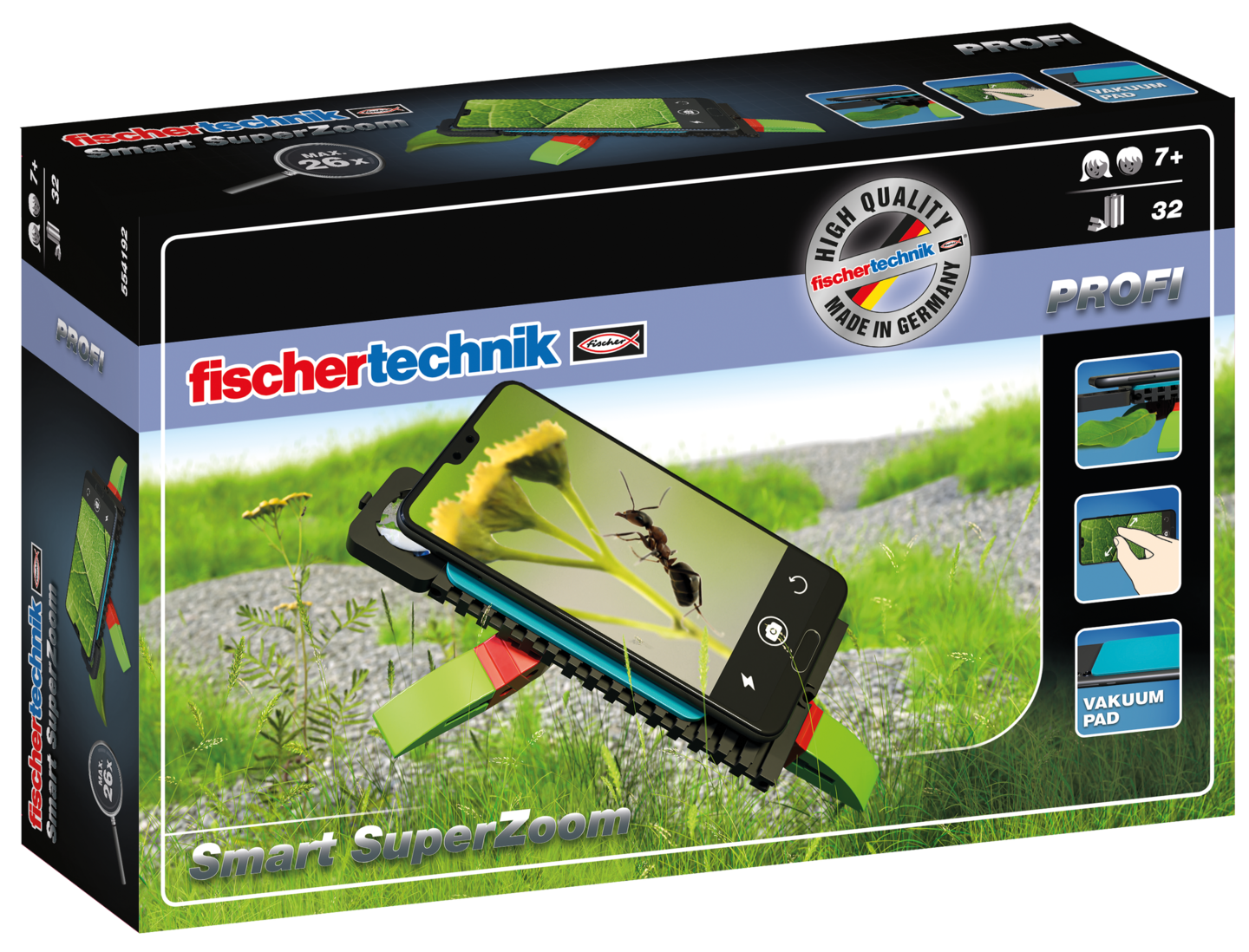 Wow, mit diesem coolen fischertechnik Baukasten wird dein Smartphone zum echten Mikroskop! Einfach die 32 Teile nach der verständlichen Anleitung zusammenbauen, Handy drauf - und schon kannst du Insekten, Blätter oder was auch immer bis zu 26-fach vergrößern. Das coole Vakuumpad hält dein Smartphone sicher fest, ohne Kleber oder Spuren zu hinterlassen. Perfekt für unterwegs, denn die Lupe ist schön handlich. Du brauchst keine extra App, einfach die normale Handykamera aktivieren und losforschen! Übrigens: Mit dem LED-Set von fischertechnik (separat erhältlich) machst du sogar bei Dunkelheit tolle Entdeckungen. Das Beste: Qualität Made in Germany, wie man es von fischertechnik gewohnt ist. Ein super Geschenk für neugierige Entdecker ab 7 Jahren!