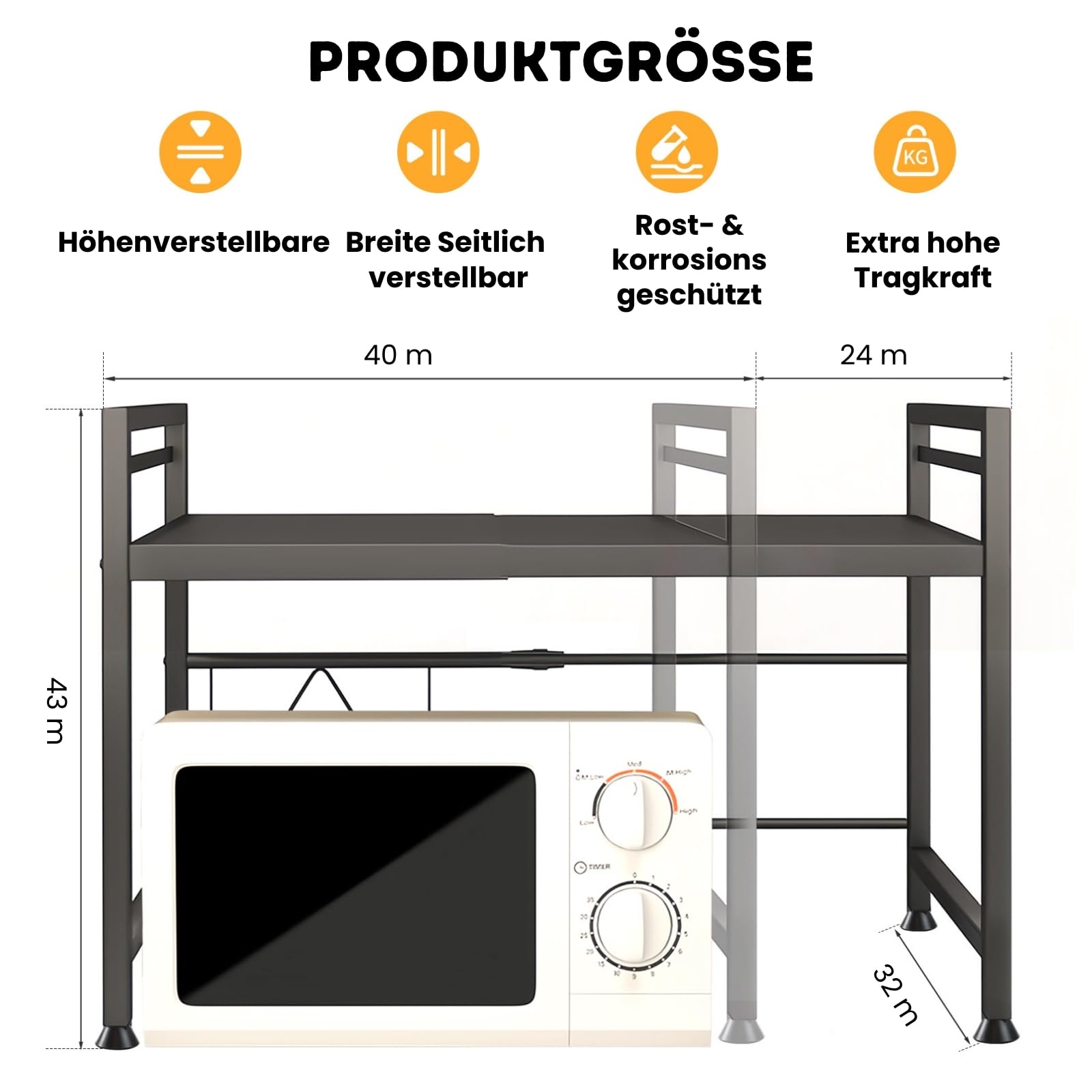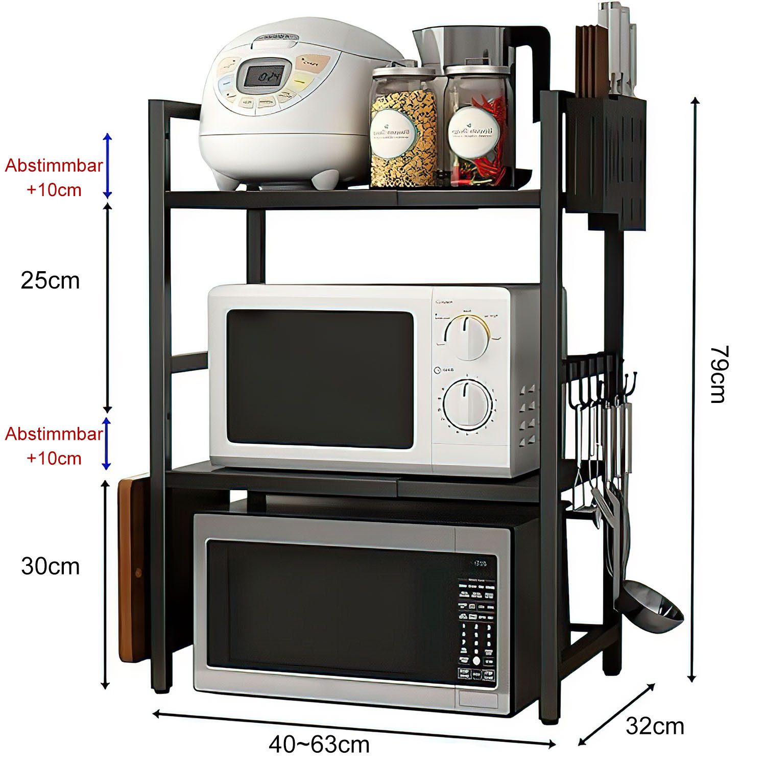 Platzproblem in der Küche? Das Allyson Mikrowellenregal schafft Abhilfe! Mit 3 Etagen und Höhenverstellung in 5-cm-Schritten passt es in jede Küchennische. Aus robustem, einbrennlackiertem Stahl, trägt es sicher deine Mikrowelle, Gewürze oder Kochbücher. Die Anti-Rutsch-Füße sorgen für Standfestigkeit, die 8 Haken bieten extra Stauraum für Kochlöffel oder Schürzen. Einfach montiert, sofort einsatzbereit – ob auf der Arbeitsplatte oder in der Ecke. Endlich mehr Ordnung und alles griffbereit. So macht Kochen Spaß!