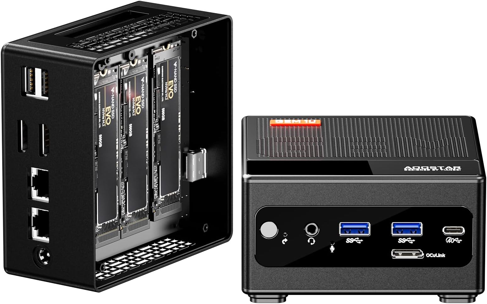 Der AOOSTAR GEM10 ist ein absolutes Kraftpaket in Mini-Format! Mit dem Ryzen 7 7840HS Prozessor (8 Kerne/16 Threads, bis zu 5,1 GHz) und der integrierten Radeon 780M Grafikeinheit meistert er nicht nur anspruchsvolle Spiele, sondern auch Video-Bearbeitung und Multitasking mit Leichtigkeit. Die 32 GB LPDDR5 RAM mit 6400 MHz und die 1 TB PCIe 4.0 SSD sorgen für ultraschnelle Performance. Das absolute Highlight: Der OCuLink-Anschluss mit 64 Gbps ermöglicht den Anschluss externer Grafikkarten wie der RTX 4070/4080 mit minimalem Leistungsverlust! Dazu kommen USB 4.0, zwei HDMI 2.1 Anschlüsse für Triple-4K-Display-Setup, WiFi 6 und duale 2.5G LAN Ports. In nur 0,6 Liter Gehäusevolumen packt dieser Mini-PC mehr Power als so mancher großer Tower! Perfekt für Gamer, Content Creator und alle, die maximale Performance auf minimalem Platz brauchen. Einfach aufstellen, anschließen und von der geballten Power begeistern lassen!
