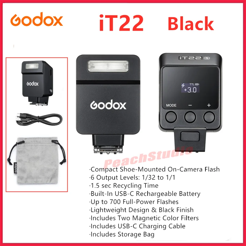 Wow, dieser Godox iT22 ist wirklich ein Game-Changer für Sony-Fotografen! Mit nur 45 Gramm ist er superleicht und passt in jede Fototasche. Perfekt für unterwegs, wenn du spontan tolle Momente festhalten willst.\n\nDie intelligente TTL-Funktion macht das Blitzen super einfach - keine komplizierten Einstellungen mehr, der Blitz regelt alles automatisch. Und falls du doch manuell eingreifen willst: Ein Knopfdruck genügt zum Wechsel zwischen TTL und Manuell-Modus!\n\nDas coole Feature: Die magnetischen Aufsätze! Diffusor und Farbfilter (CTO/CTB) einfach draufsnappen und schon veränderst du die Lichtstimmung. Kreativität war noch nie so einfach!\n\nTechnische Highlights: 700 Blitze mit einer Akkuladung, Recyclingzeit von nur 1,5 Sekunden bei voller Leistung. Der eingebaute 7,4V 300mAh Akku lädt via USB-C - praktisch!\n\nBlitzleistung stufenlos von 1/32 bis 1/1 einstellbar, in feinen 1/3-Stufen. So hast du die volle Kontrolle über dein Licht.\n\nIm Lieferumfang: Blitzgerät, USB-C Kabel, Aufbewahrungstasche, magnetischer Diffusor und zwei CTO-Farbfilter. Alles was du brauchst für perfektes Licht!\n\nEgal ob drinnen oder draußen - dieser Mini-Blitz ist dein perfekter Begleiter für kreative Fotografie!