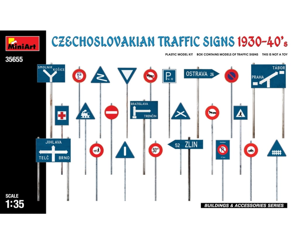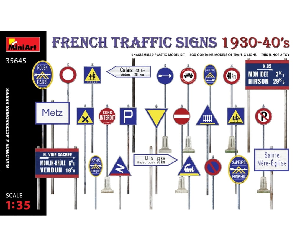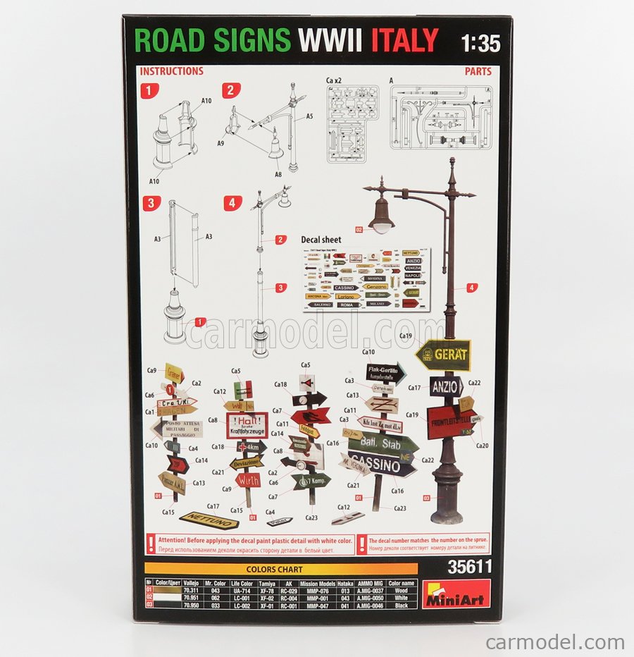 Hey Modellbau-Fans! Dieses superdetaillierte MiniArt-Set bringt originalgetreue italienische Verkehrsschilder aus dem Zweiten Weltkrieg in den Maßstab 1:35. Perfekt für alle, die ihre Dioramen authentisch gestalten wollen! 🚧\n\nDas Besondere: Jedes Schild ist liebevoll nachgebildet und wartet darauf, von dir montiert und individuell lackiert zu werden. Die Teile passen perfekt zusammen - versprochen!\n\nIm Lieferumfang findest du eine bebilderte Anleitung, die dich Schritt für Schritt durch den Aufbau führt. Aber Achtung: Kleber, Farben und Werkzeug suchst du vergebens - die musst du separat besorgen.\n\nIdeal für:\n• Historische Dioramen\n• Militär-Modellbau\n• Sammler von WWII-Memorabilia\n• Hobbybastler ab 14 Jahren\n\nMaßstab: 1:35\nMarke: MiniArt\nSchwierigkeitsgrad: Mittel\nAltersempfehlung: Ab 14 Jahren\n\nMach deine Modellbau-Landschaft mit diesen authentischen Verkehrsschildern komplett! Egal ob für Straßenszenen oder Checkpoints - diese Details machen jeden Bau einzigartig.