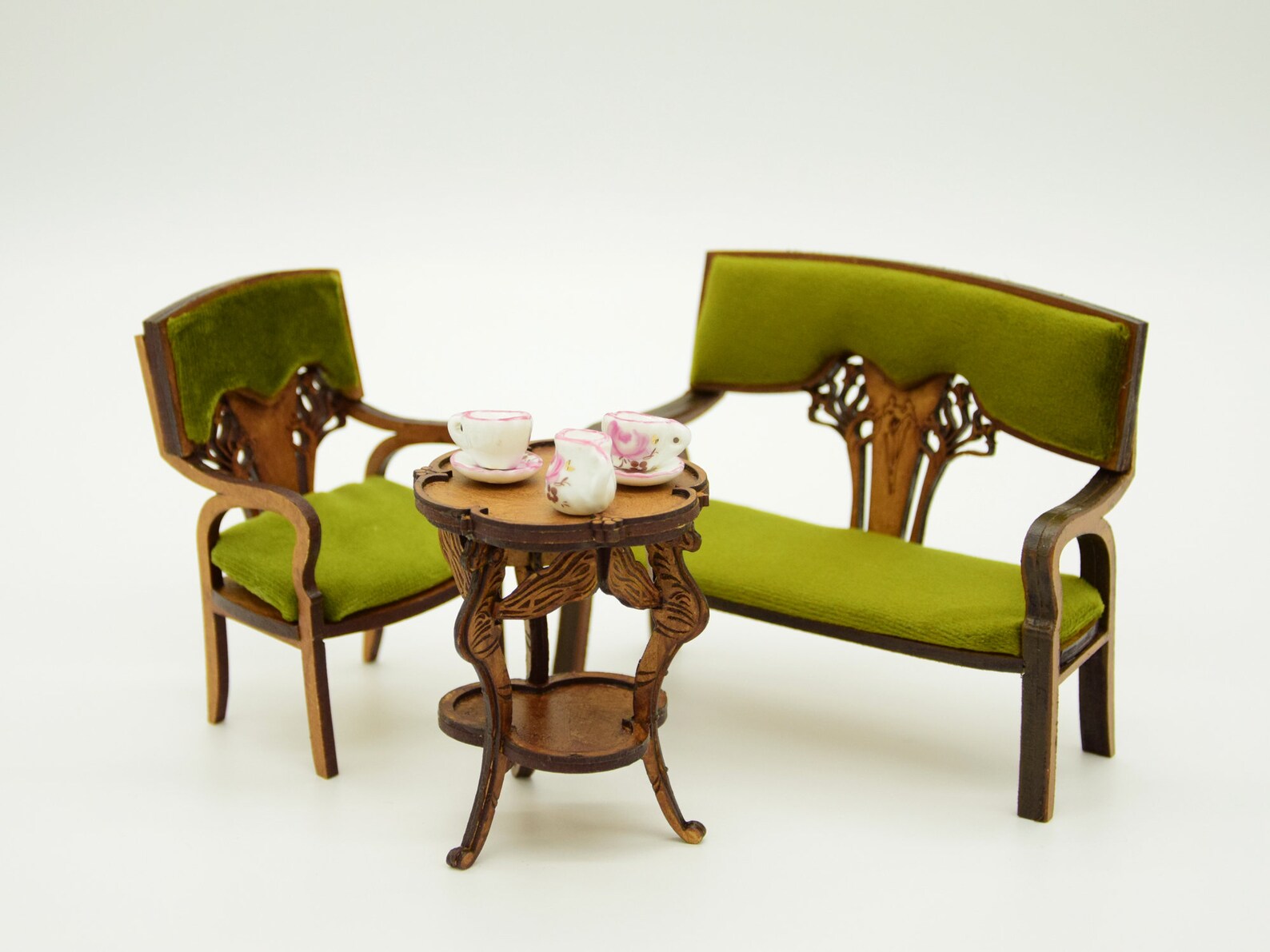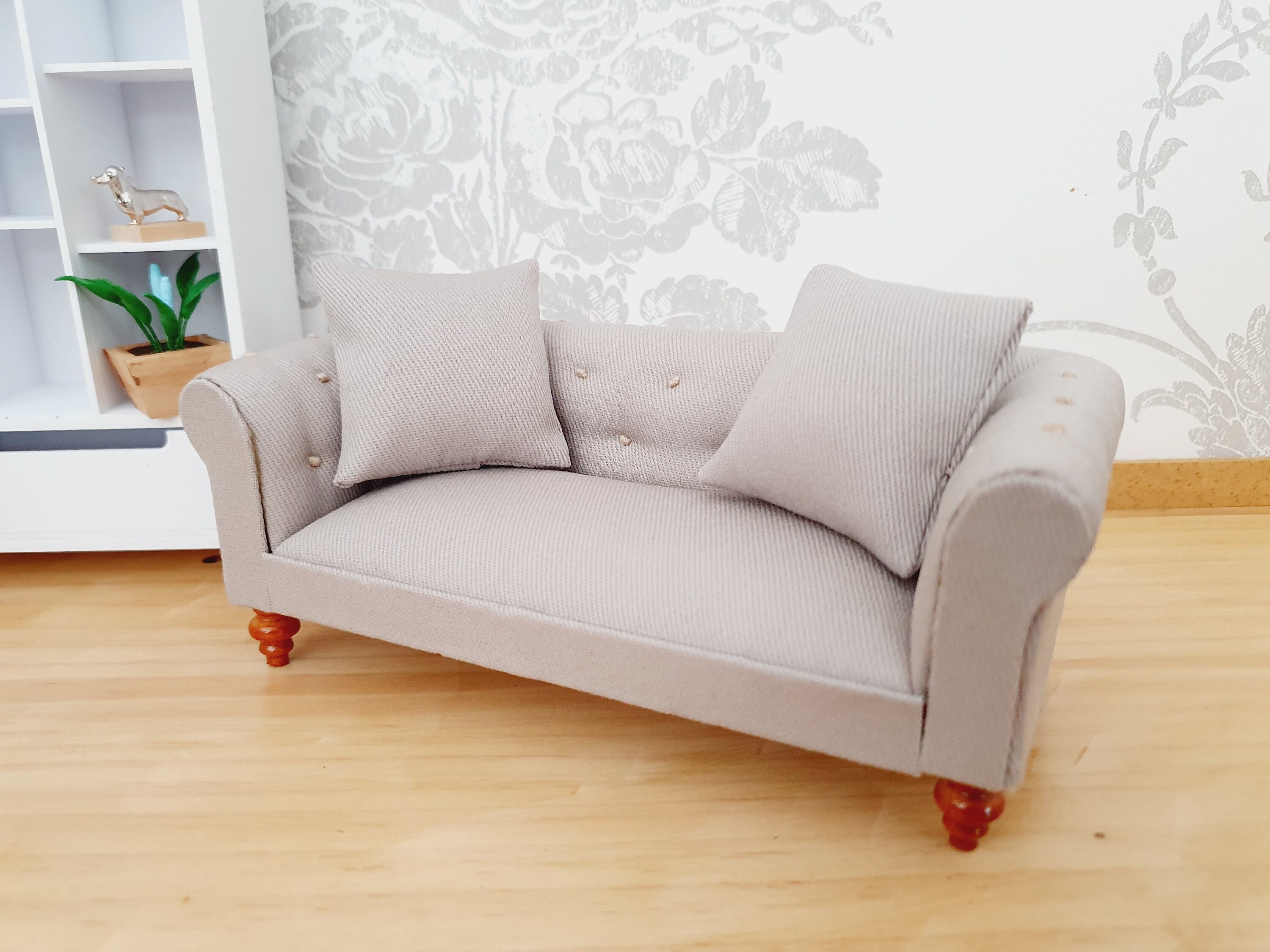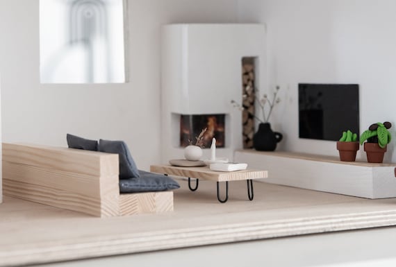 Wie niedlich ist denn dieses Puppenhaus-Möbel-Set? Es enthält einen Zweisitzer-Sessel, einen Einsitzer-Sessel und einen weißen Couchtisch - alles, was du für ein gemütliches Puppenhaus-Wohnzimmer brauchst! Im Maßstab 1/12 passen die Möbel perfekt zu den meisten Standard-Puppenhäusern.\n\nDie Sessel sind aus Holz und Stoff gefertigt und sogar gepolstert - genau wie echte Möbel! Der Couchtisch bietet Platz für Miniatur-Vasen, Bücher oder winzige Kaffeetassen. So kannst du eine bezaubernde Szene für eine Puppen-Teeparty gestalten.\n\nDie Details sind einfach liebevoll: Von der Stoffbezug-Naht bis zur Holzstruktur ist alles so realistisch gestaltet, dass man fast vergisst, dass es sich um Miniaturmöbel handelt. Perfekt für Kinder, die mit Puppenhäusern spielen, aber auch für Erwachsene, die Miniatur-Dioramen sammeln.\n\nDas Set ist ein tolles Geschenk für kleine Puppenhaus-Fans oder als Ergänzung für bereits bestehende Puppenhaus-Sammlungen. Es fördert die Kreativität und die Feinmotorik der Kinder, während sie ihre eigenen kleinen Welten gestalten.\n\nIn unserem Shop findest du noch weitere Puppenhaus-Möbel für Badezimmer, Küchen und Gärten - so kannst du nach und nach ein komplettes Puppenhaus einrichten. Einfach ein entzückendes Set, das garantiert für strahlende Augen sorgt und stundenlangen Spielspaß bietet!