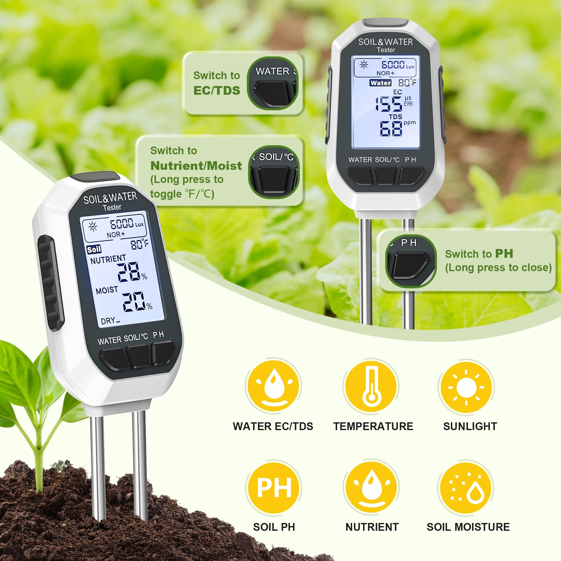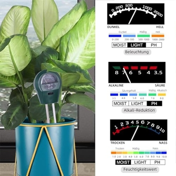 Perfekt für alle Pflanzenfreunde! Dieser praktische 4-in-1 Bodentester nimmt dir das Rätselraten ab - er misst genau, was deine Pflanzen wirklich brauchen. Einfach die 20cm lange Sonde in die Erde stecken und nach 10 Sekunden siehst du auf dem großen LCD-Display mit Hintergrundbeleuchtung alle wichtigen Werte: Bodenfeuchtigkeit (5 Stufen), pH-Wert (12 Stufen von 3,5-9,0), Temperatur (-9°C bis 50°C) und Sonnenlicht (9 Stufen bis 9999 Lux). Der drehbare Kopf (0-45°) macht das Ablesen super einfach. Automatische Abschaltung spart Batterie - benötigt 4 AAA-Batterien (nicht im Lieferumfang). Ideal für Garten, Balkon oder Gewächshaus. Endlich wissen, wann deine Pflanzen wirklich Wasser brauchen!