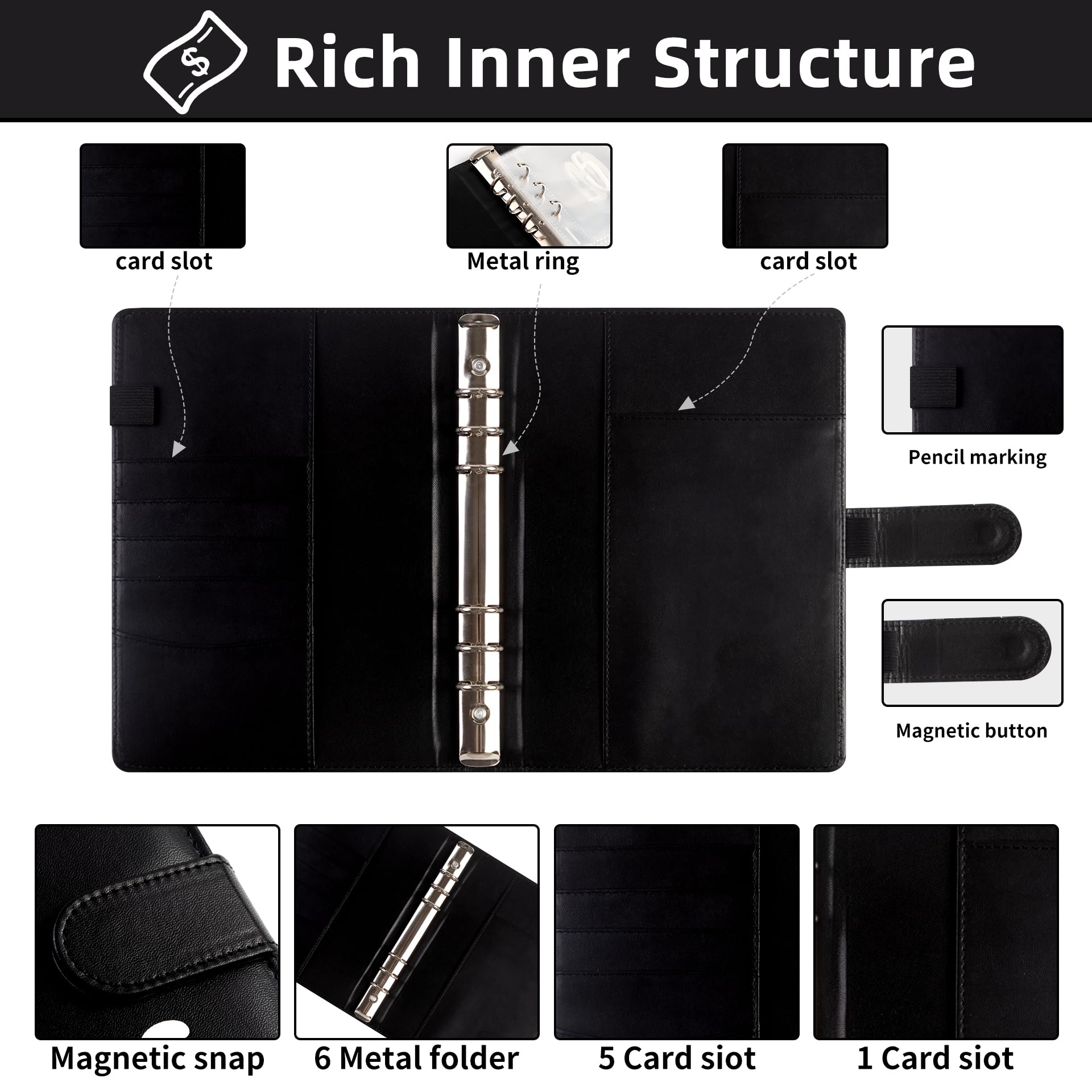 Das A6-Format (17,8x11 cm) passt perfekt in Handtasche oder Schublade. Aus wasserdichtem PU-Material schützt der Binder dein Geld vor Verschüttungen und Abnutzung. Der elastische Fixiergurt hält alles sicher an Ort und Stelle - keine verlorenen Umschläge mehr!