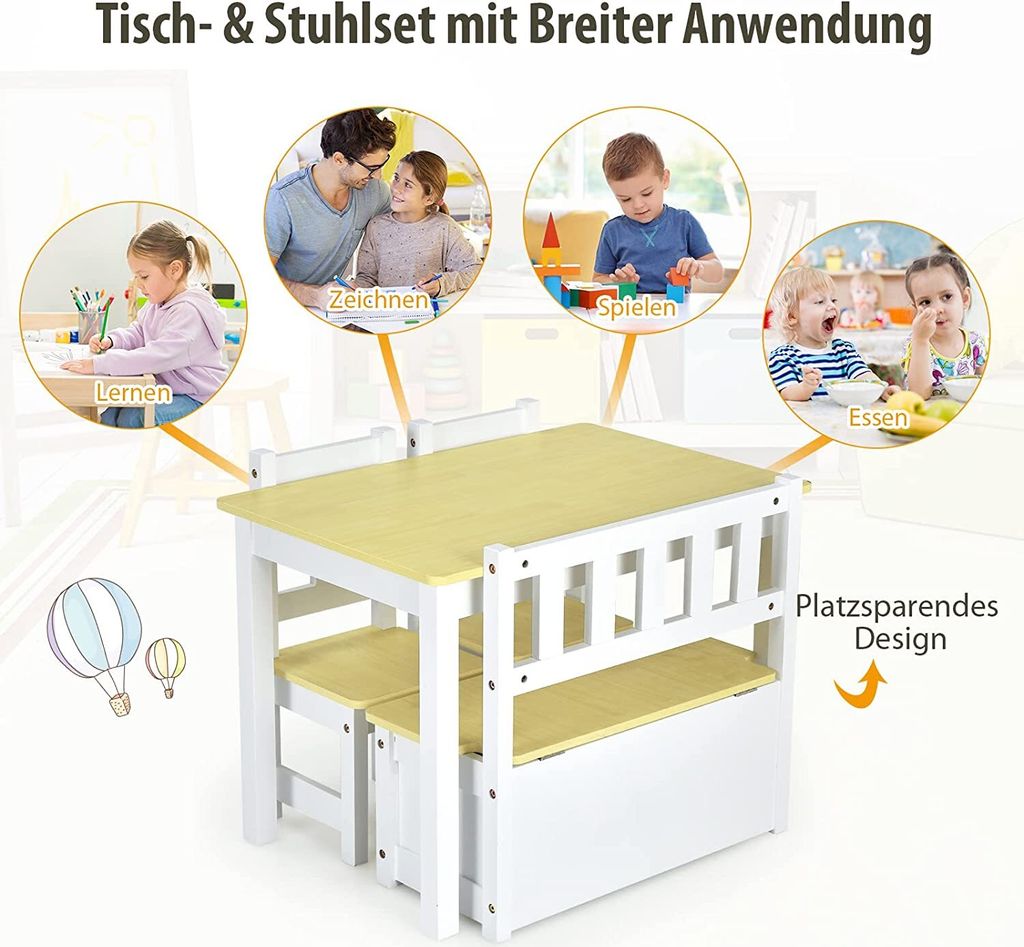 Perfektes Möbelstück für Kinderzimmer! Dieses 4-teilige Set enthält: 1 Tisch (70x48x51 cm), 2 Stühle und 1 Sitzbank mit verstecktem Staufach. Aus robustem Kiefernholz und MDF gefertigt. Stühle und Bank passen platzsparend unter den Tisch. Tragkraft: Tisch 50 kg, Stühle 27 kg, Bank 80 kg. Abgerundete Ecken für maximale Sicherheit. Ideal für Malen, Hausaufgaben, Spielen oder Essen. Einfache Montage ohne Spezialwerkzeug. Glatte Oberfläche leicht zu reinigen. Macht jedes Kinderzimmer zum gemütlichen Spielparadies!