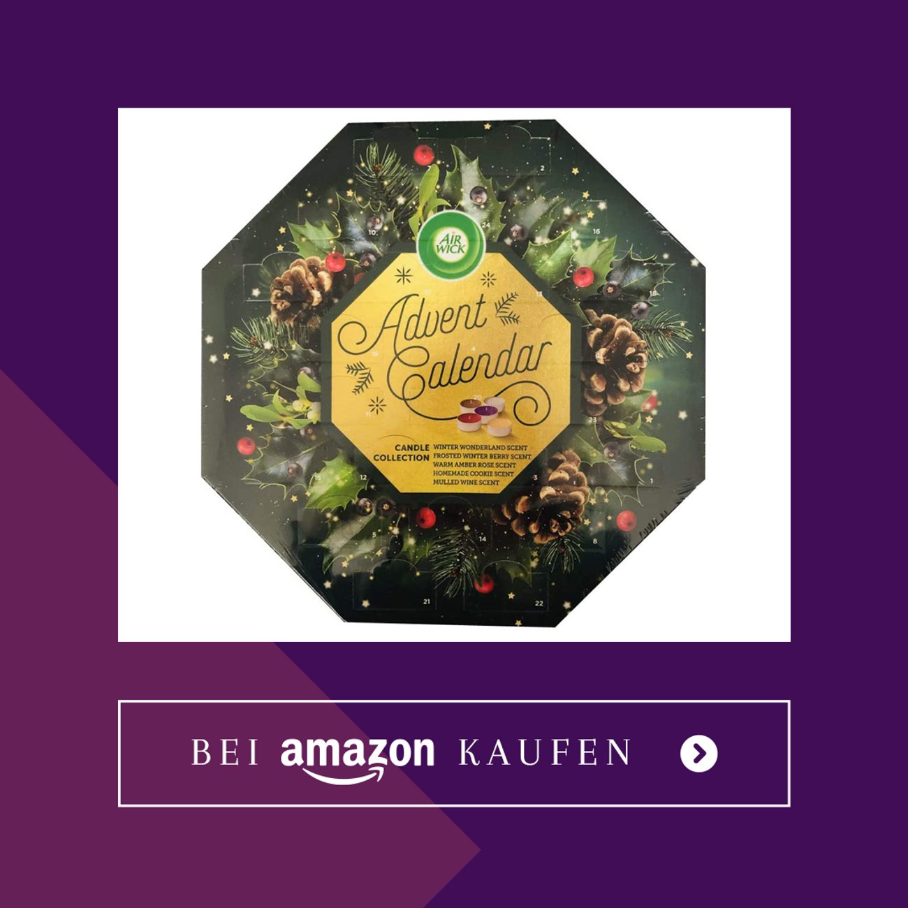 24 Tage voller Duftwunder! Dieser Adventskalender mit 24 verschiedenen Duftkerzen macht die Vorweihnachtszeit zum sinnlichen Erlebnis. Von Rose über Vanille bis Osmanthus - jeden Tag ein neues, bezauberndes Aroma. Die Teelichter aus umweltfreundlichem Sojawachs brennen bis zu 5 Stunden und verbreiten wohlige Weihnachtsstimmung. Perfekt als Geschenk für Mama, Freundin oder Tochter - oder einfach für dich selbst! Jedes Teelicht ist edel verpackt und sieht auch als Deko super aus. Mach dein Zuhause zur duftenden Weihnachts-Oase! 🎄