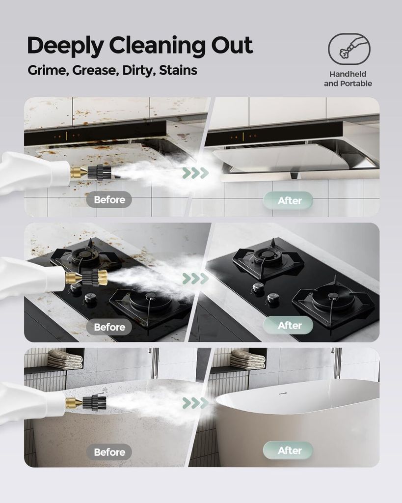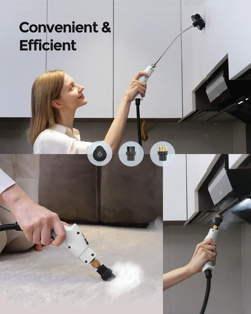 Putzen ohne Chemie - mit der Power von 105°C Heißdampf! Dieser 2500W Dampfreiniger macht short work mit Fett, Schmutz und Keimen. Mit 3 Bar Druck und 6 Stufen regelbar, für jede Verschmutzung die passende Stärke. Der 1,1L Wassertank reicht für längere Putzsessions. Im Lieferumfang: große und kleine Nylonbürste, Stahlbürste und Verlängerungsstange für schwer erreichbare Stellen. Perfekt für Küche, Bad, Auto, Terrasse - überall wo's sauber werden soll. Aus robustem ABS-Material und mit EU-Stecker. Macht Putzen endlich effektiv und umweltfreundlich!