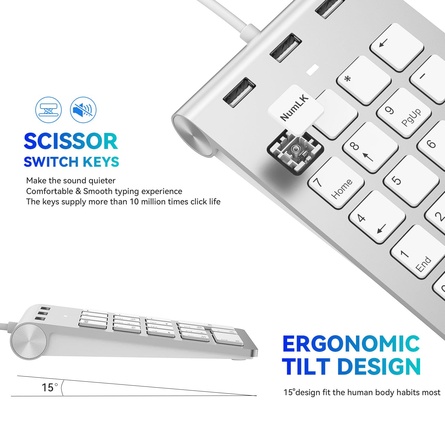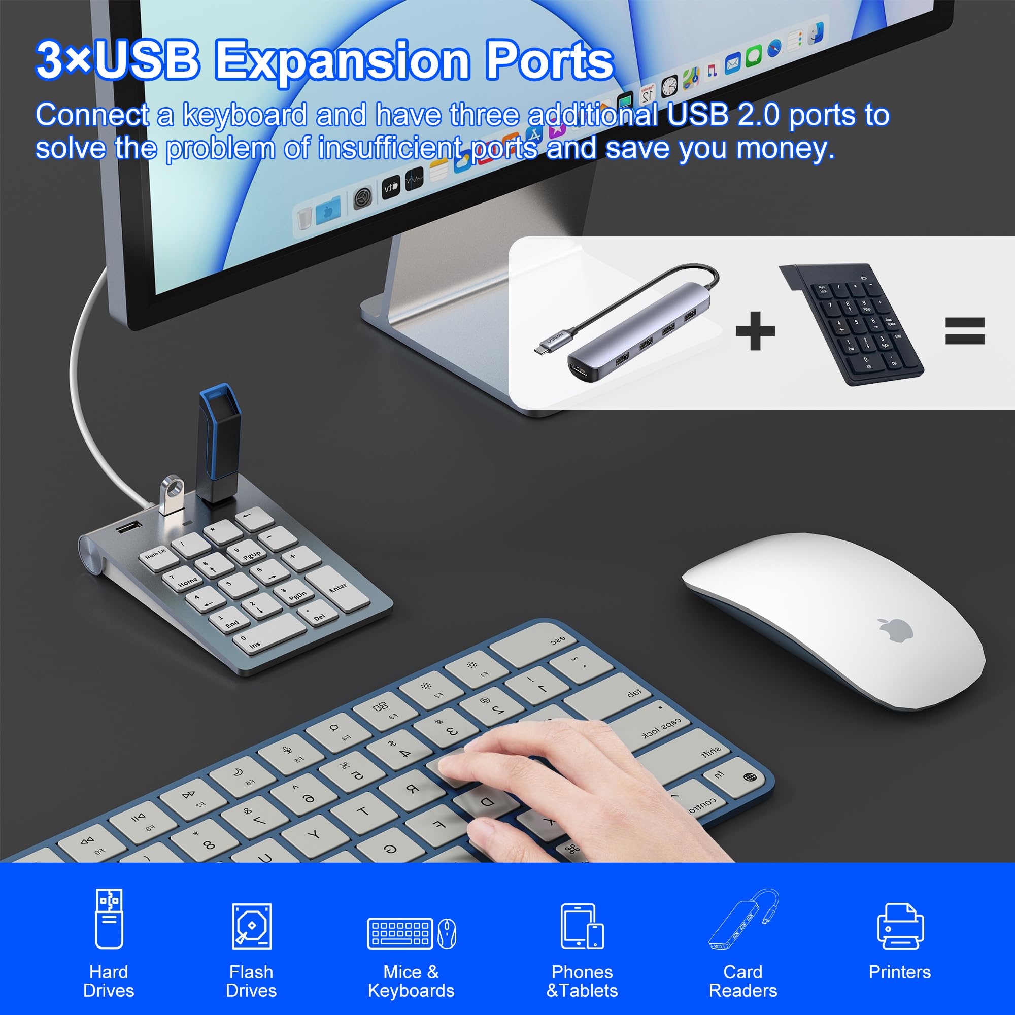 Dieses Numpad ist die perfekte Ergänzung für deinen Laptop! Mit USB-C und USB-A Anschluss - passt an fast jedes Gerät. 18 leise Tasten mit Scherenmechanik für angenehmes Tippen. Das Beste: 3 USB 2.0-Hubs für Maus, Stick oder andere Geräte (bis 480 Mbit/s). 15° neigtes Design für ergonomisches Arbeiten. Superflach und nur 50cm Kabel. Plug-and-Play - keine Treiber nötig. Kompatibel mit Windows, macOS und Chrome OS. Perfekt für Buchhalter, Excel-Nutzer oder alle, die viel mit Zahlen arbeiten. Endlich wieder ein richtiger Nummernblock für deinen schlanken Laptop!
