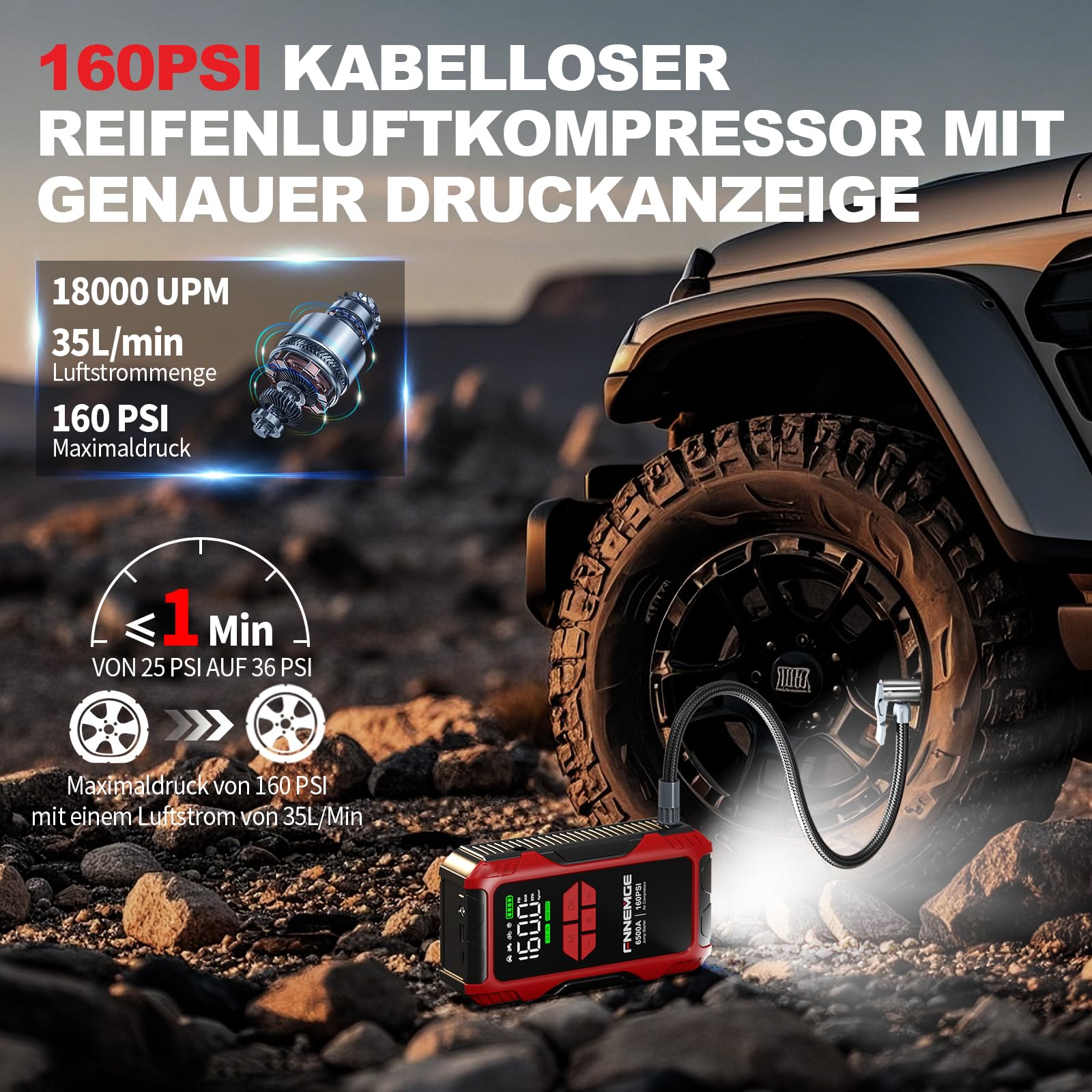 Jungex, diese FNNEMGE Starthilfe-Powerbank ist ja mal der absolute Alleskönner! 6500A Spitzenstrom - damit startest du praktisch jedes 12V-Fahrzeug: Benziner, Diesel bis 10 Liter, Motorräder, Boote, sogar deinen Rasenmäher! Aber das ist noch nicht alles: Da ist ein Luftkompressor mit 160 PSI drin - pumpt dir in Minuten den Reifen auf! Mit 3 Adaptern für Bälle, Luftmatratzen und co. Und als ob das nicht reicht: 26800mAh Powerbank für Handy & Tablet! Das LCD-Display zeigt dir alles an - Batteriestand, Luftdruck, Warnungen. Die Beleuchtung hat 400 Lumen mit 3 Modi: Dauerlicht, SOS und Blitz - perfekt für Pannen! 10 Schutzmechanismen sorgen für Sicherheit gegen alles mögliche. Kommt im praktischen EVA-Koffer mit allem Zubehör. 24 Monate Garantie - da kannst du beruhigt zuschlagen! Ob täglicher Gebrauch, Reisen oder Outdoor - damit bist du für jede Situation gewappnet!