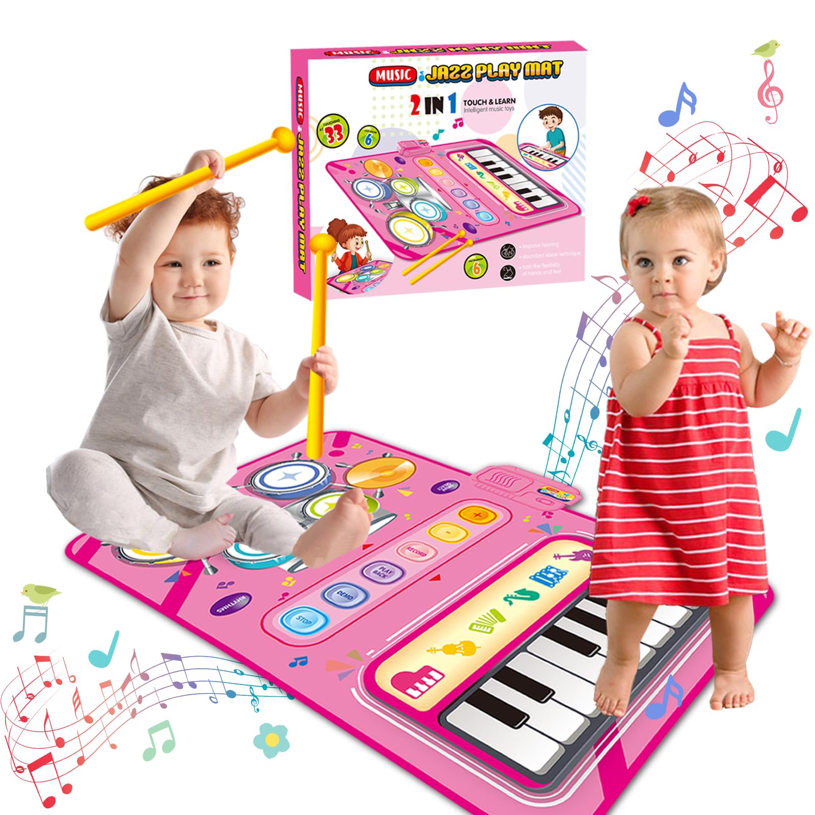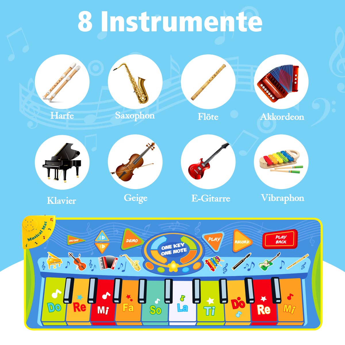 Wow, diese Klaviermatte bringt richtig Leben in die Bude! Deine Kids werden total begeistert sein - da können sie nach Herzenslust rumhüpfen und dabei noch was lernen. Die Matte hat ganze 8 verschiedene Instrumente wie Klavier, Gitarre, Geige und sogar Saxophon! Dazu 14 coole Melodien, die zum Mittanzen einladen. Das Beste: Die Aufnahmefunktion speichert alles, was dein kleiner Mozart da so komponiert. Aus rutschfestem ABS- und PE-Material ist die Matte super sicher und hält auch wildeste Tanzattacken aus. Perfekt für Kinder von 3 bis 12 Jahren - ob als Geburtstagsgeschenk oder für Weihnachten. Und das Schönste: Du kannst mit deinen Kids zusammen spielen und so die Bindung stärken. Die Matte fördert nicht nur das Rhythmusgefühl, sondern auch Koordination und Reaktionsvermögen. Einfach Batterien rein (3 AA, nicht dabei) und los geht der Musik-Spaß! Echt praktisch, dass man sie leicht reinigen kann und sie immer wieder verwendbar ist.
