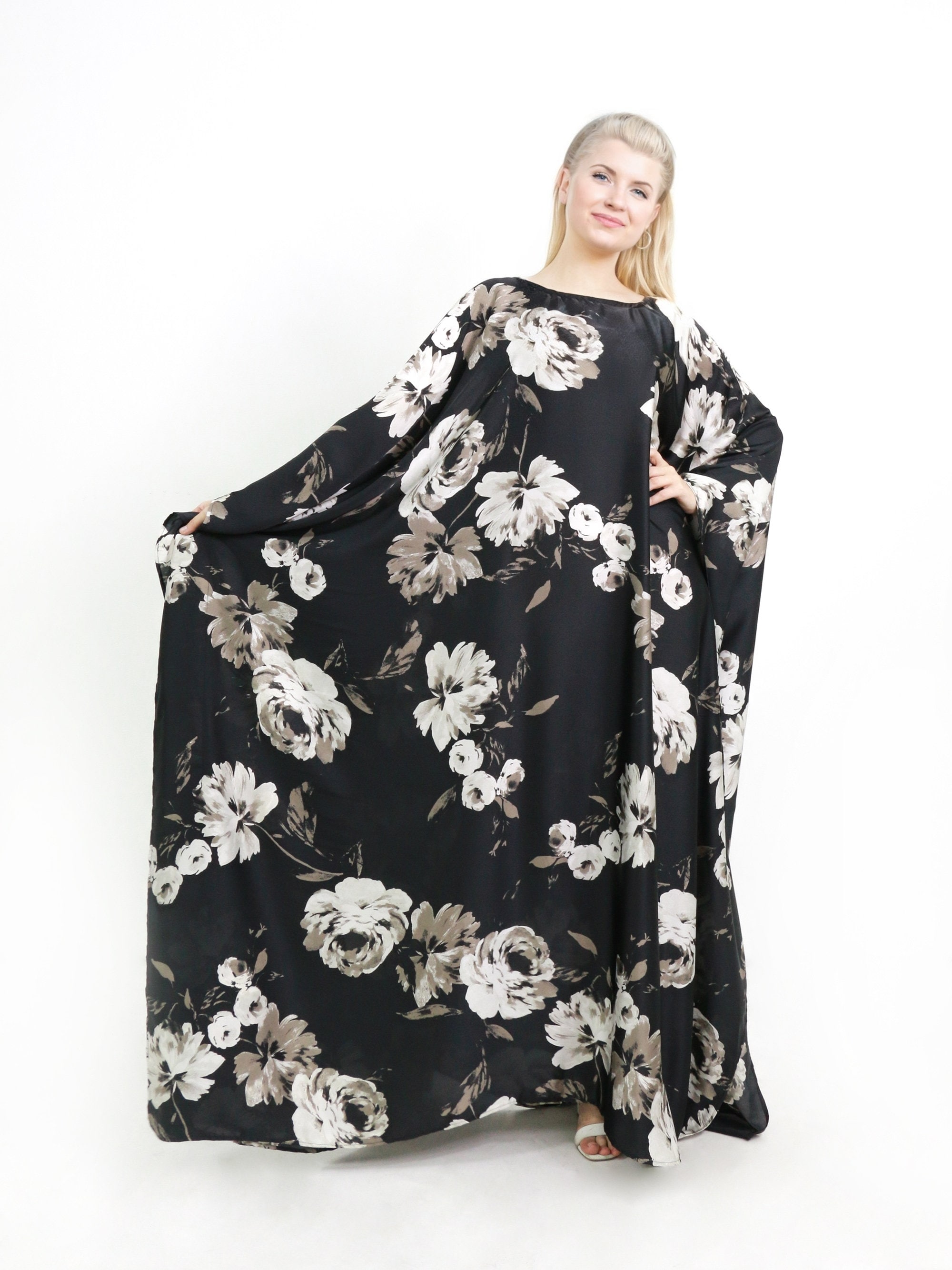 Stylish und bedeckt - dieses wunderschöne Abaya-Kleid ist perfekt für den Sommer! Aus glänzendem Satin-Stoff gefertigt, der sich super weich und angenehm auf der Haut anfühlt. Die trendigen Batwing-Ärmel geben dir viel Bewegungsfreiheit und sehen total modisch aus. Mit bodenlanger Länge und dekorativem Blumenmuster ist dieses Kleid ein echter Hingucker. Der V-Ausschnitt verlängert optisch den Hals und der integrierte Hüftgürtel betont deine Figur. Perfekt für muslimische Frauen, aber auch super für alle, die sich vor der Sonne schützen wollen. Ob fürs Gebet, Familienfeiern, Einkaufen oder besondere Anlässe wie Eid oder Hochzeiten - dieses Kleid macht immer eine gute Figur. Mit verstecktem Reißverschluss auf der Rückseite ist das An- und Ausziehen ganz einfach. Ein echter Allrounder für deine Sommer-Garderobe!