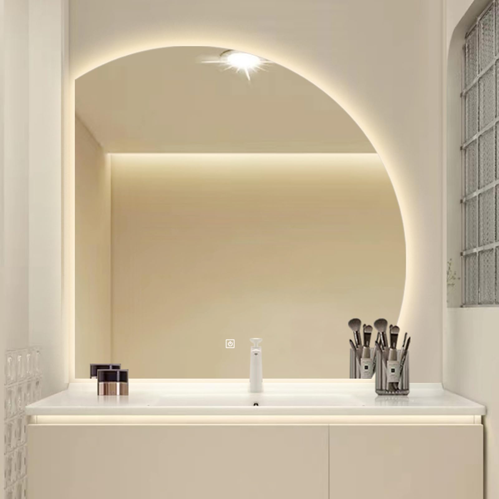 Dieser halbrunde Badezimmerspiegel ist einfach der Hammer! Mit LED-Beleuchtung in 3 Farben und stufenloser Dimmung von 10-100%. Per Touch-Steuerung bedienbar, merkt sich sogar deine letzte Einstellung. Erhältlich in 50, 60, 70 oder 80 cm Größe. Das rahmenlose Design sieht super modern aus und die explosionsgeschützte Folie sorgt für Sicherheit. Perfekt zum Schminken, Rasieren oder einfach nur um dein Bad aufzuwerten. HD-Spiegelglas ohne Verzerrungen, wasserfest und langlebig. Verleihe deinem Badezimmer das gewisse Etwas!